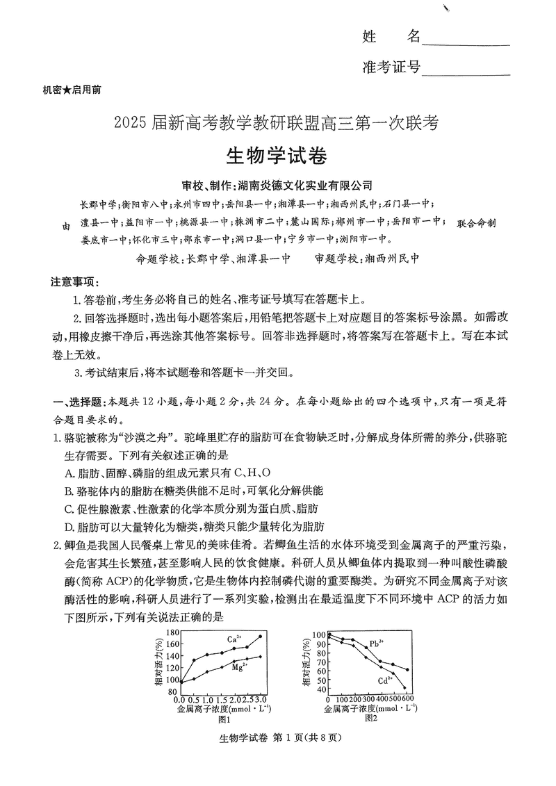 湖南省新高考教学教研联盟2025届第一次联考生物试题及答案