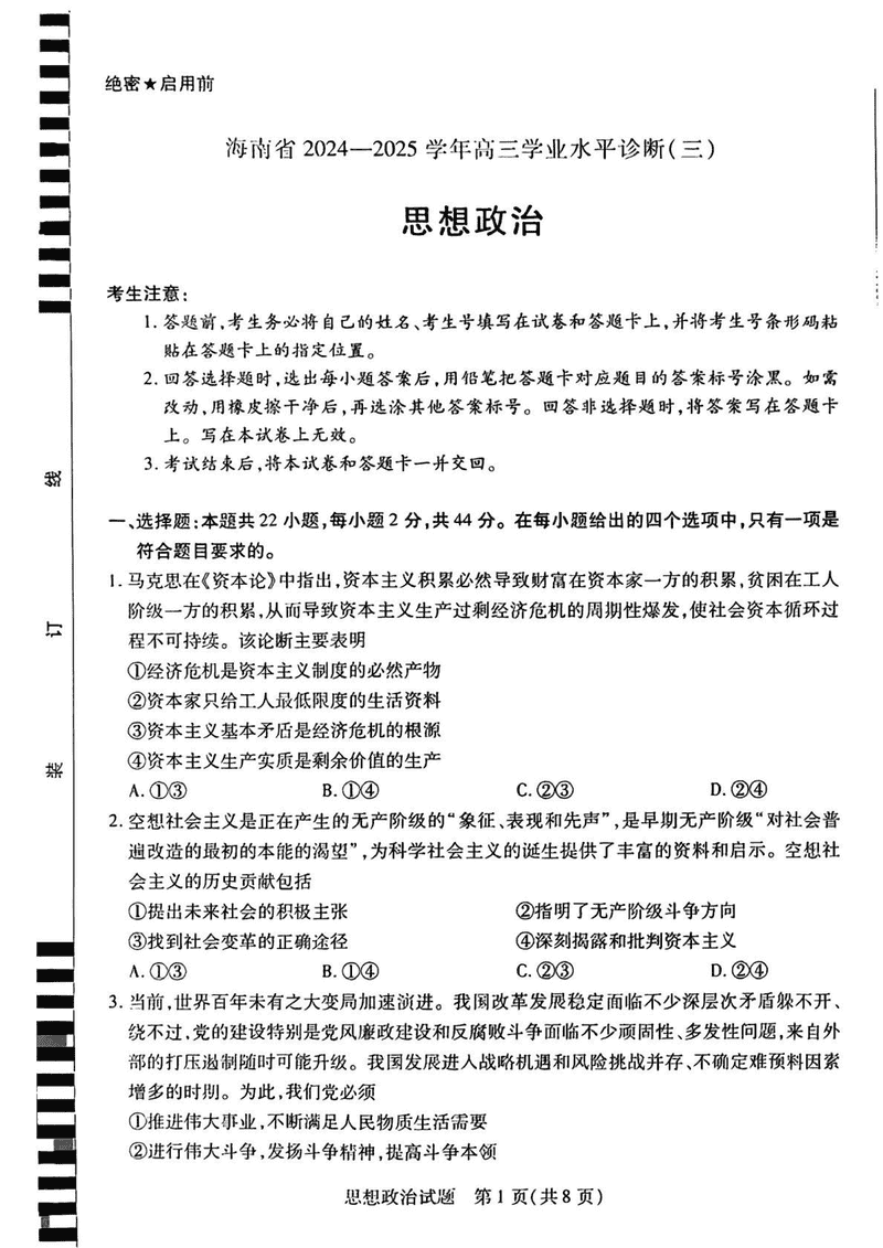 海南省天一大联考2024-2025学年高三学业水平诊断(三)政治考试已于近日开考,为方便考生考后及时查看考试情况,查漏补缺、弥补不足,本文整理了试题答案解析相关信息!