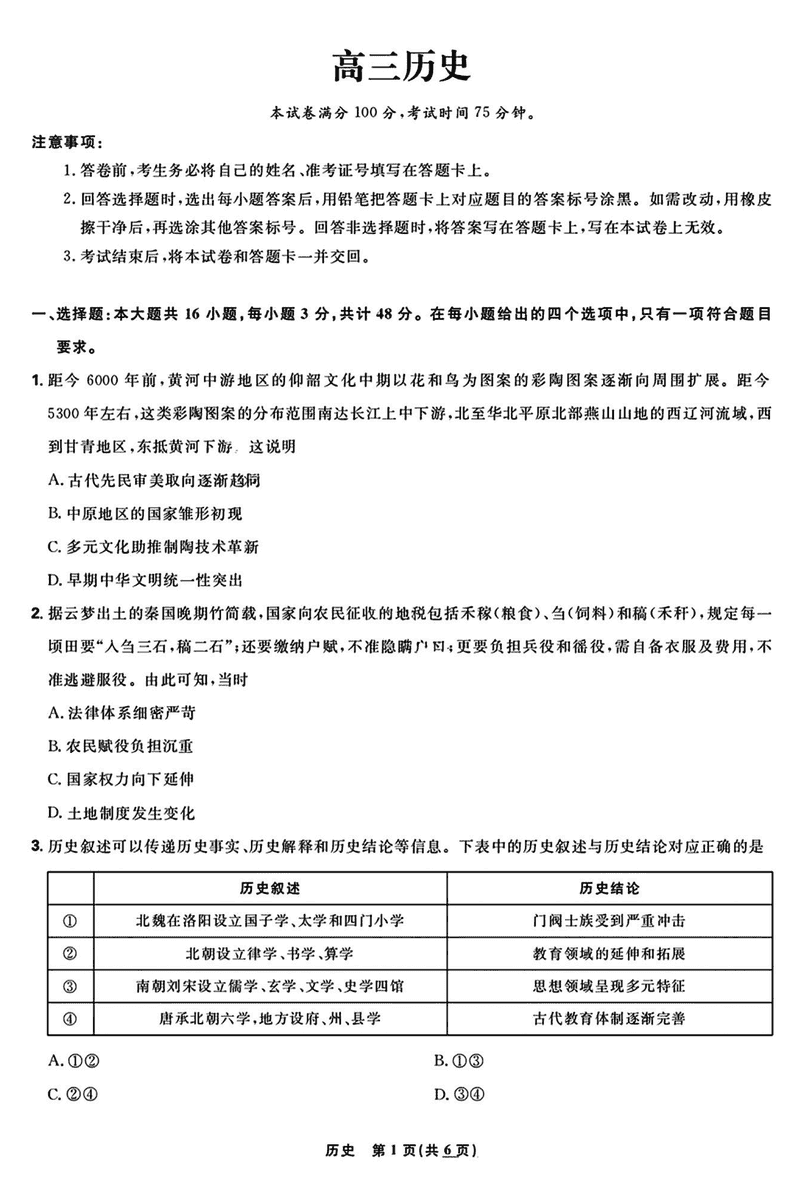 东北三省精准教学联考2025届高三3月联考历史试题及答案
