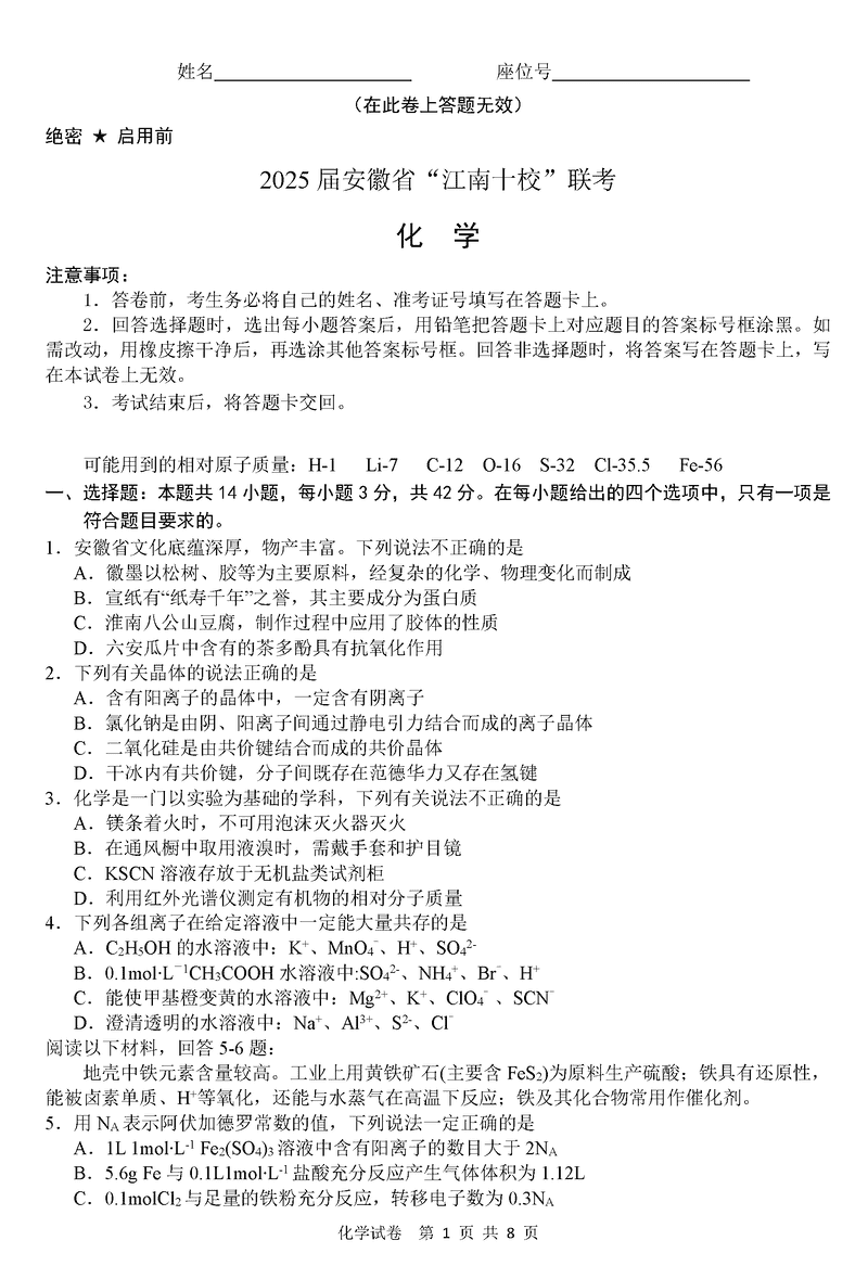 江南十校一模2025届高三下学期第一次联考化学试题及答案