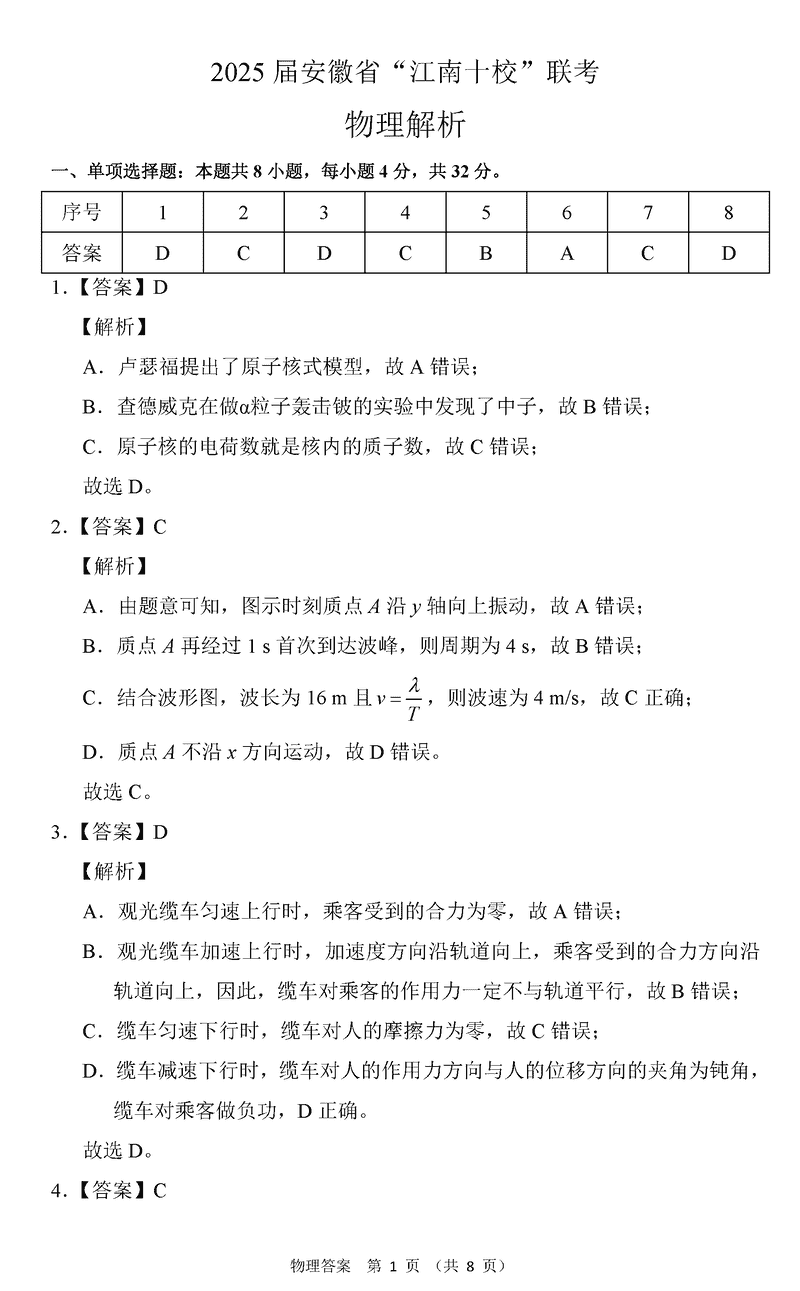 江南十校一模2025届高三下学期第一次联考物理试题及答案