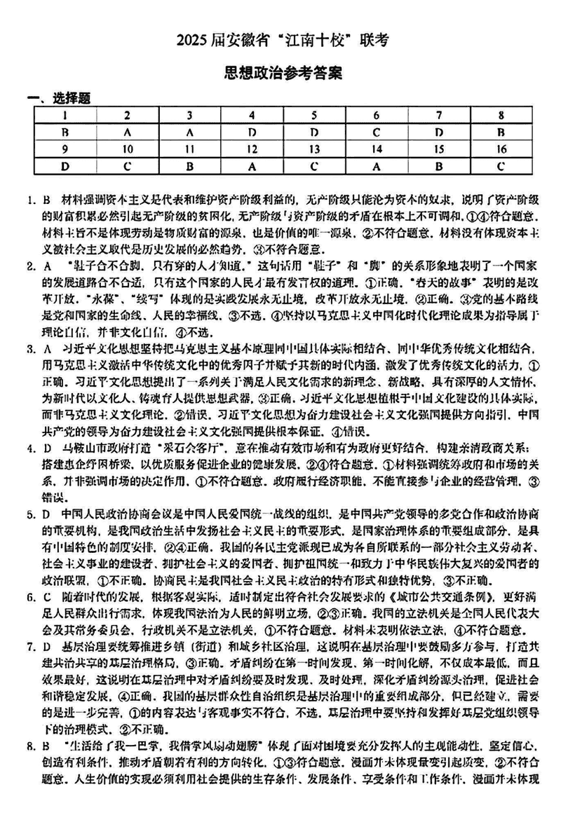 安徽省江南十校一模2025届高三下学期第一次联考政治考试已于近日开考,为方便考生考后及时查看考试情况,查漏补缺、弥补不足,本文整理了试题答案解析相关信息!