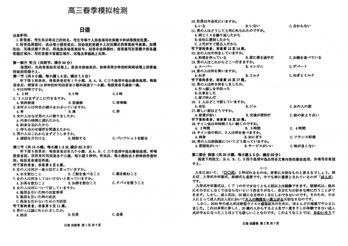 2025届河南省天一大联考高三3月春季模拟检测日语试题及答案