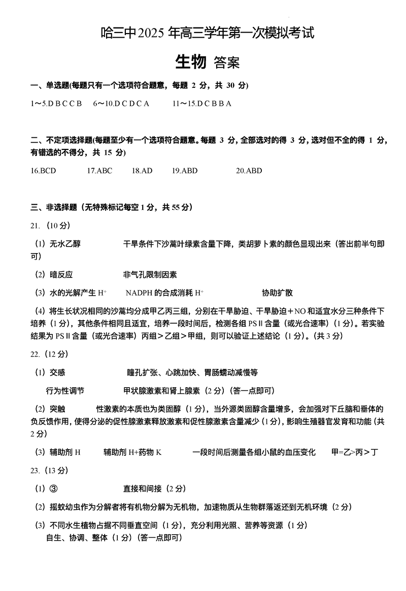 哈三中2025年高三学年第一次模考生物试题及答案 时间:2025-03-06 黑龙江 理综试题 哈三中2025年高三学年第一次模考生物考试已于近日开考,为方便考生考后及时查看考试情况,查漏补缺、弥补不足,本文整理了试题答案解析相关信息! 汇总:哈三中2025年高三学年第一次模拟考试试题及答案汇总 生物试题及答案解析
