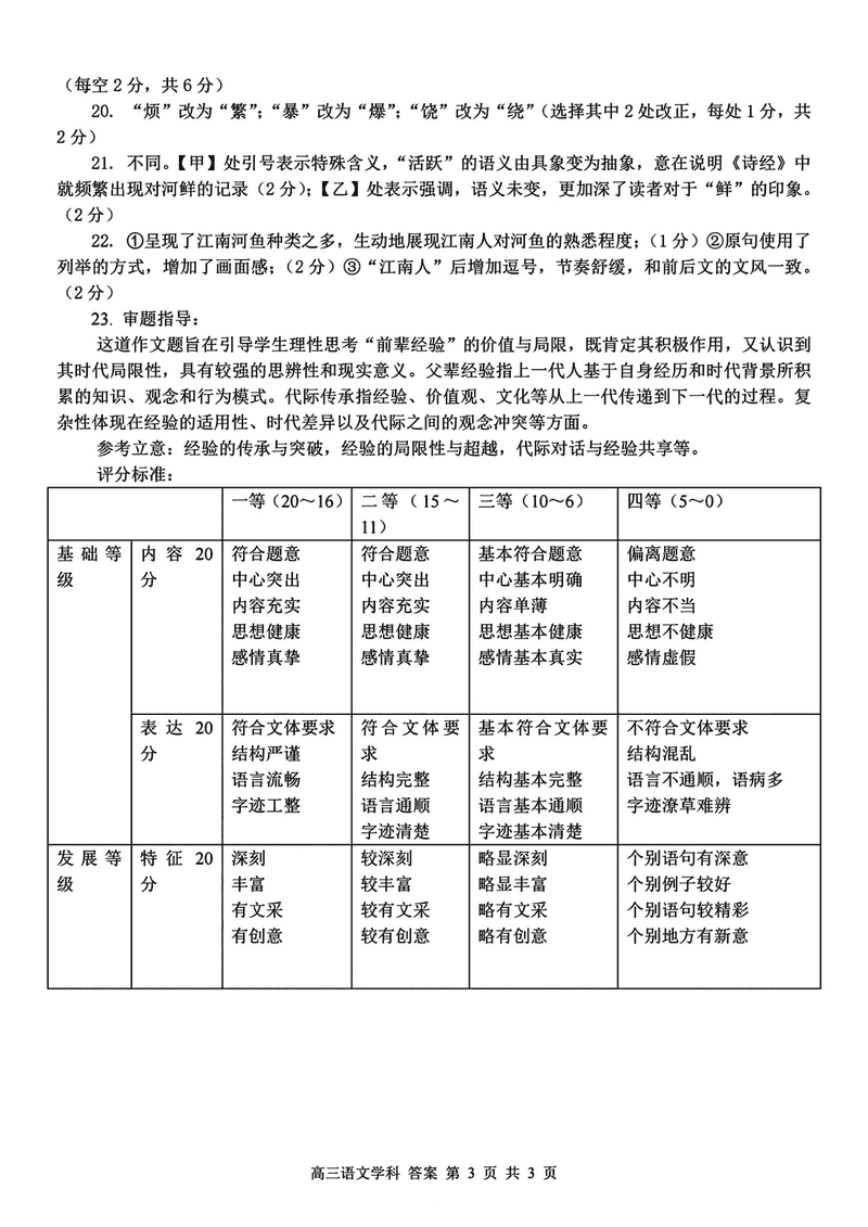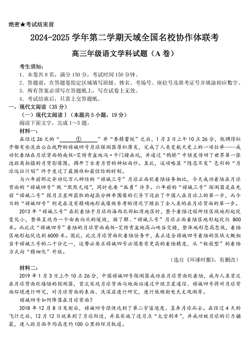 浙江天域全国名校协作体2024-2025学年高三下学期3月月考语文试题及答案