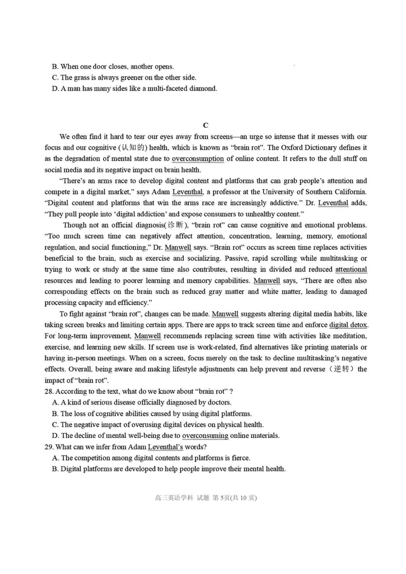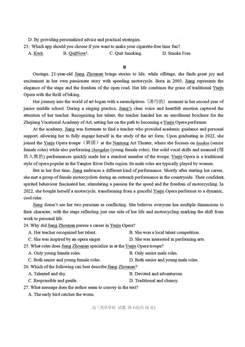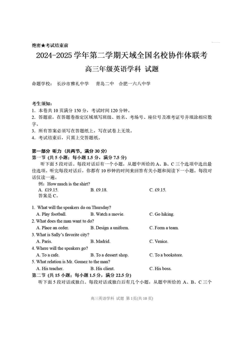 浙江天域全国名校协作体2024-2025学年高三下学期3月月考英语试题及答案