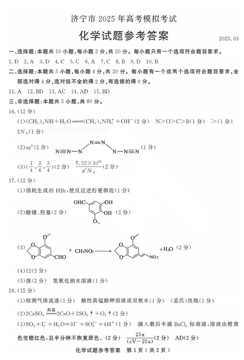 济宁一模2025年高考模拟化学试题及答案 时间:2025-03-07 山东 理综试题 济宁一模2025年高考模拟化学考试已于近日开考,为方便考生考后及时查看考试情况,查漏补缺、弥补不足,本文整理了试题答案解析相关信息! 汇总:济宁一模2025年高考模拟考试试题及答案汇总 化学试题及答案解析