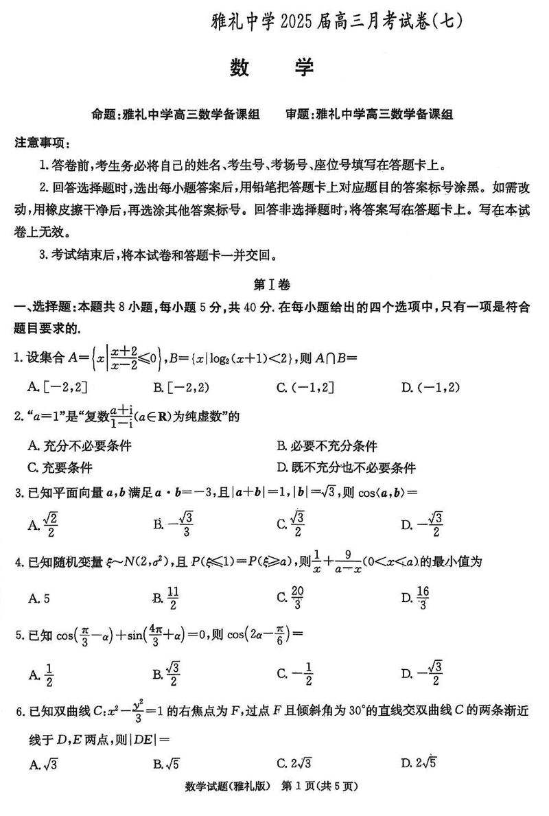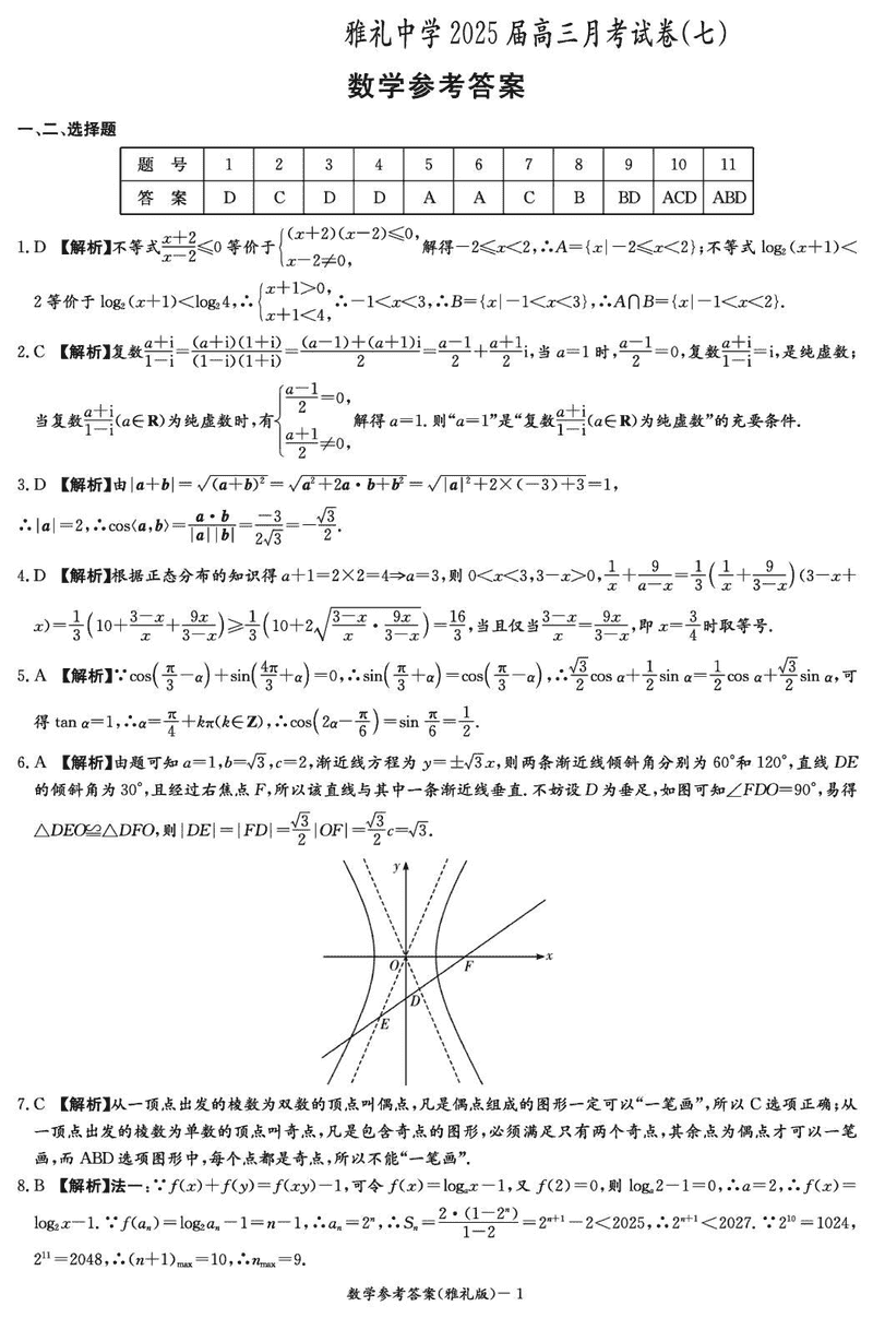 湖南雅礼中学2025届高三下学期月考卷七数学试题及答案