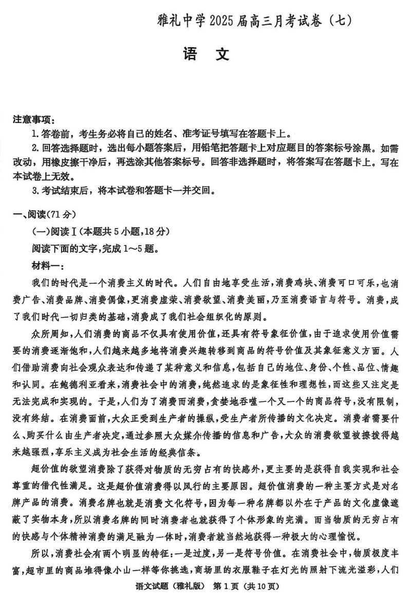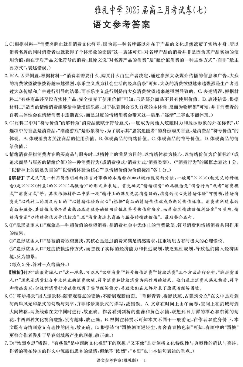 湖南雅礼中学2025届高三下学期月考卷(七)语文考试已于近日开考,为方便考生考后及时查看考试情况,查漏补缺、弥补不足,本文整理了试题答案解析相关信息!