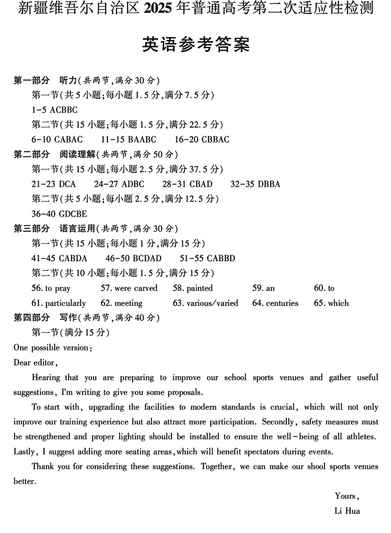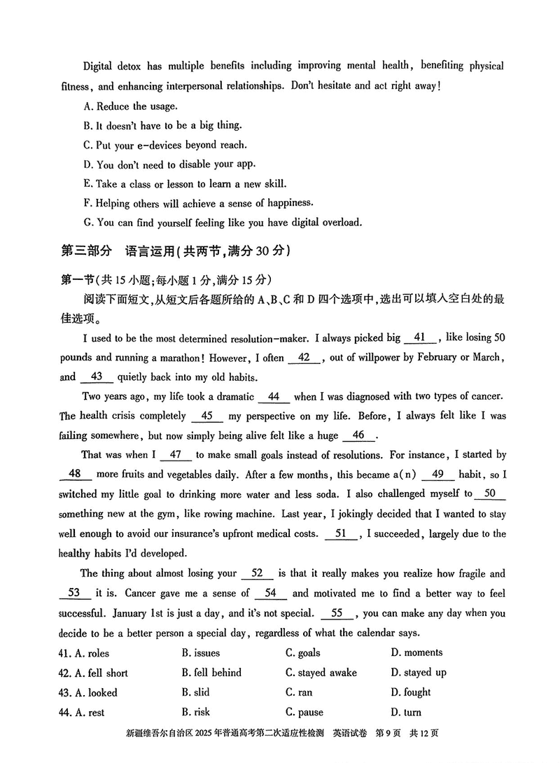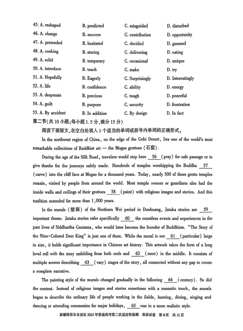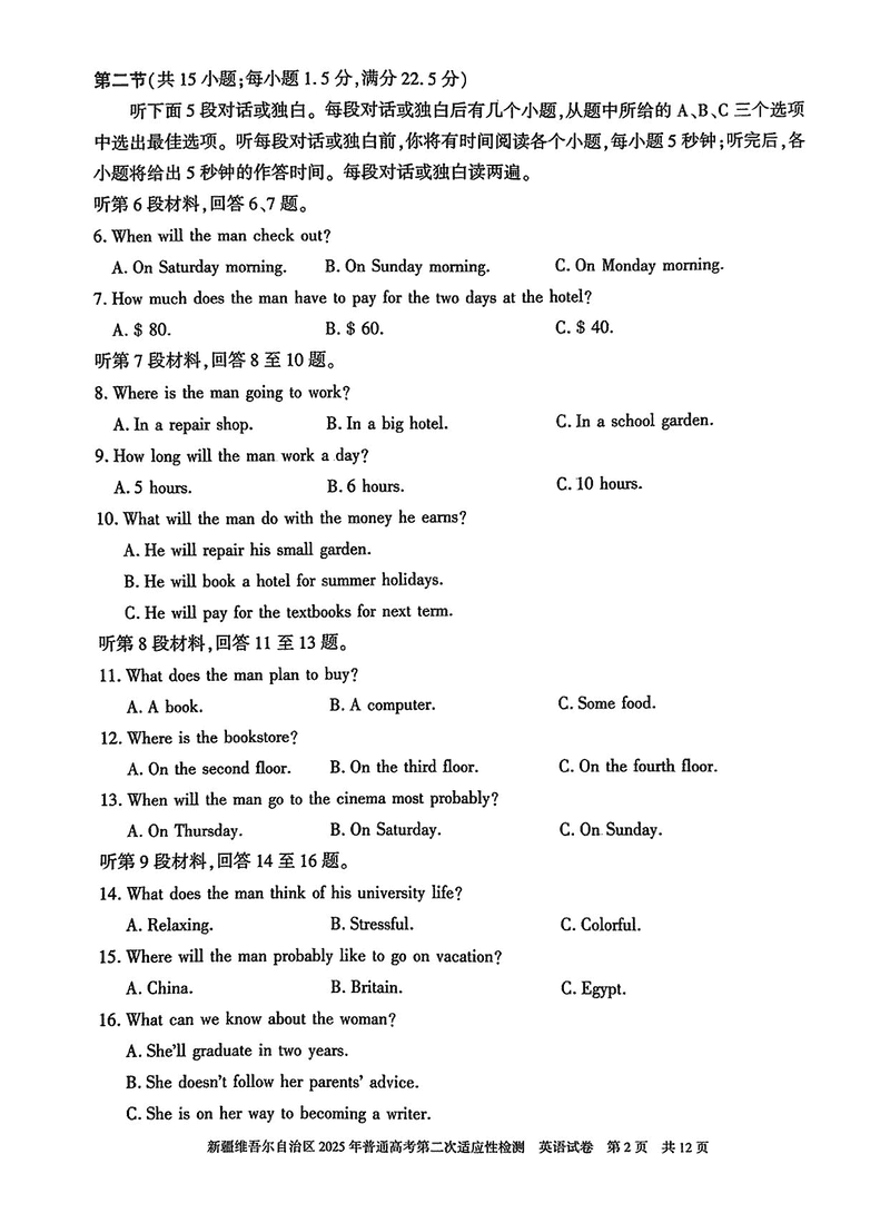 新疆2025年普通高考第二次适应性检测英语试题及答案 时间:2025-03-09 新疆 英语试题 新疆2025年普通高考第二次适应性检测英语考试已于近日开考,为方便考生考后及时查看考试情况,查漏补缺、弥补不足,本文整理了试题答案解析相关信息! 汇总:新疆2025年普通高考第二次适应性检测试题及答案汇总 英语试题及答案解析