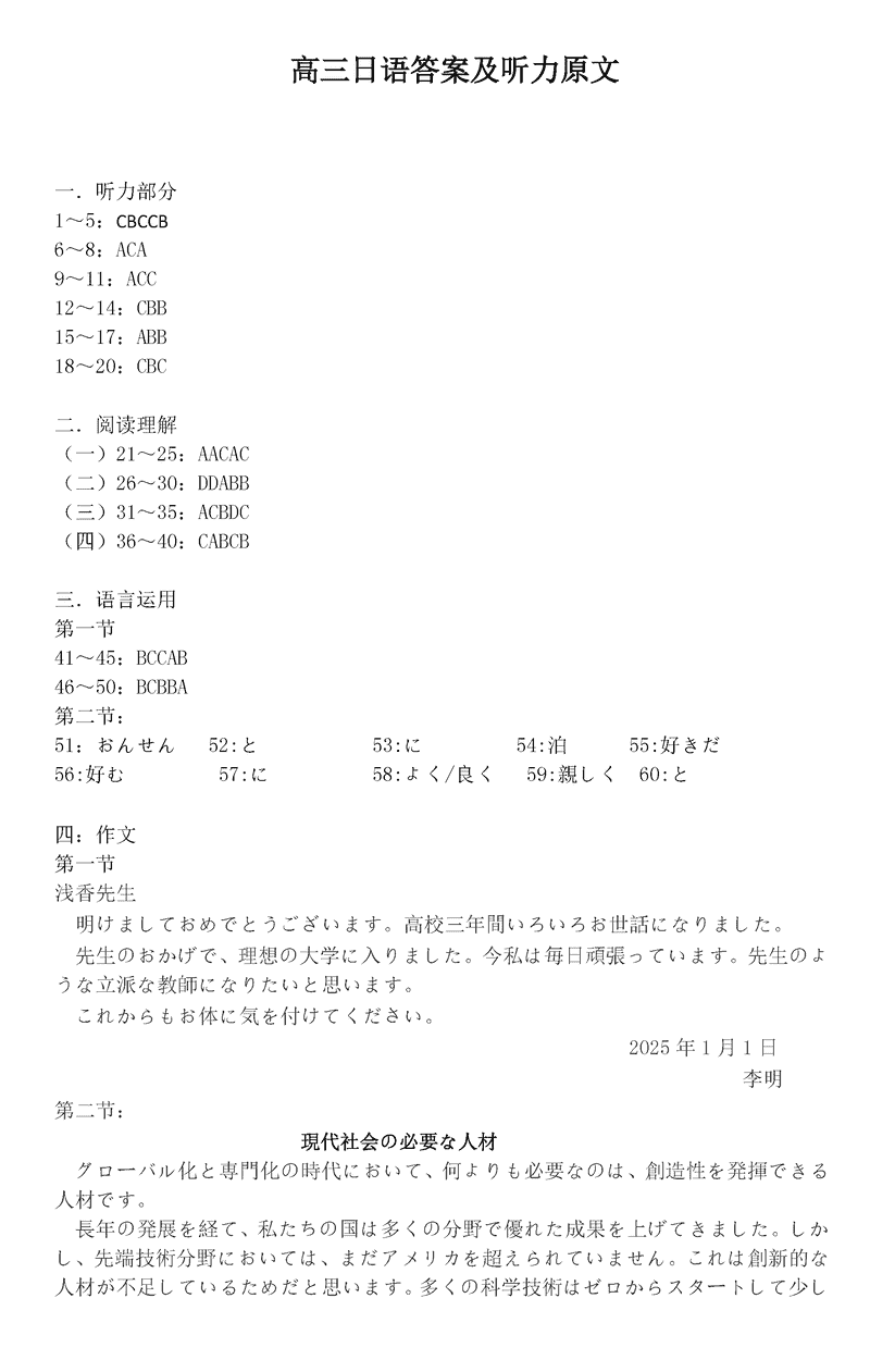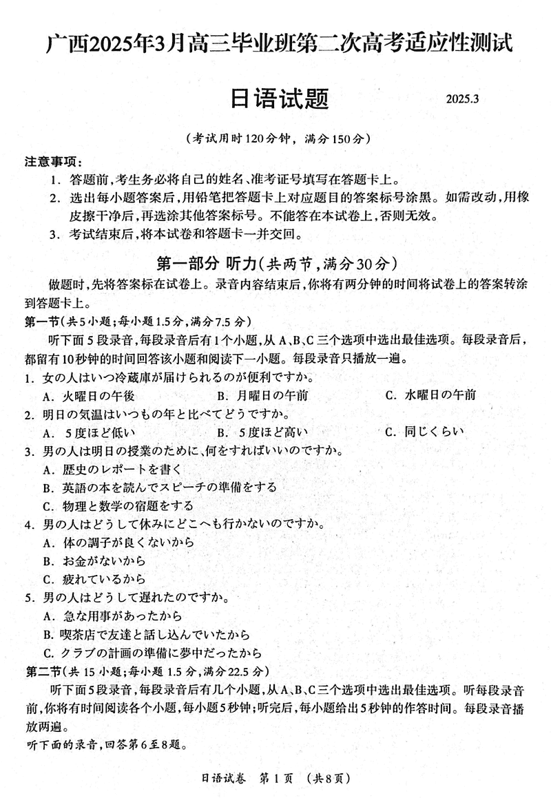 广西2025年3月高三第二次高考适应性测日语考试已于近日开考,为方便考生考后及时查看考试情况,查漏补缺、弥补不足,本文整理了试题答案解析相关信息!