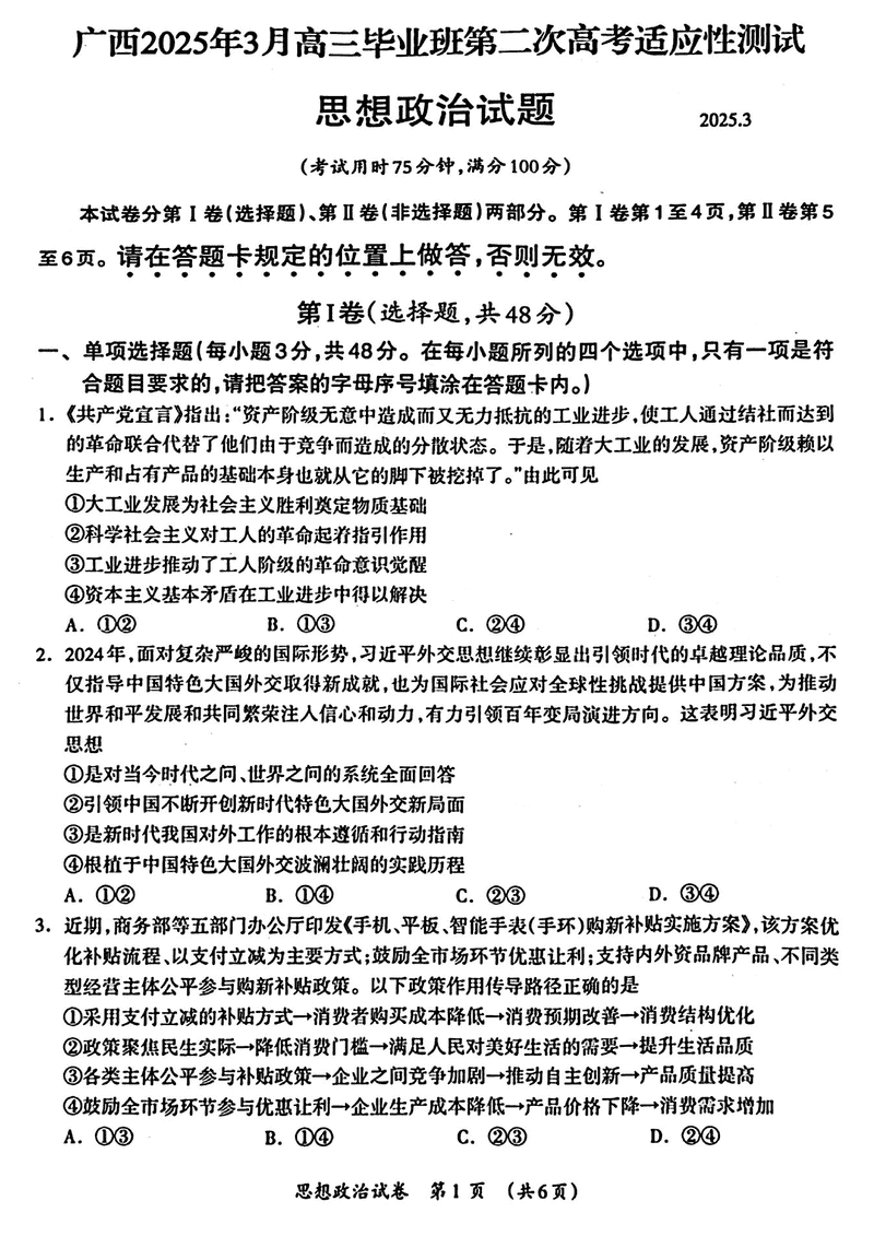 广西2025年3月高三第二次高考适应性测政治考试已于近日开考,为方便考生考后及时查看考试情况,查漏补缺、弥补不足,本文整理了试题答案解析相关信息!