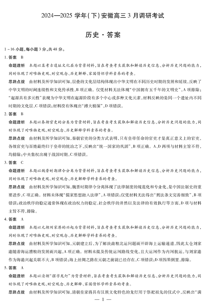 安徽省天一大联考2025届高三3月调研历史考试已于近日开考,为方便考生考后及时查看考试情况,查漏补缺、弥补不足,本文整理了试题答案解析相关信息!