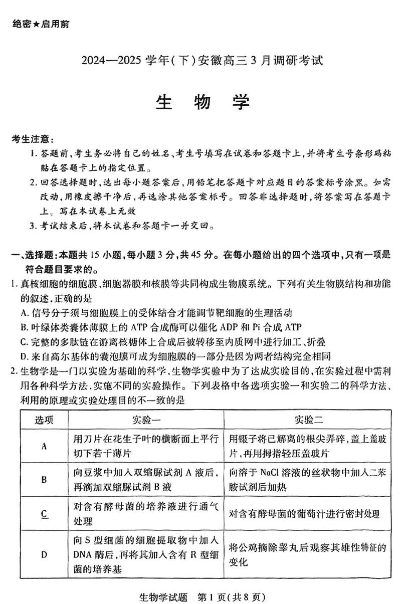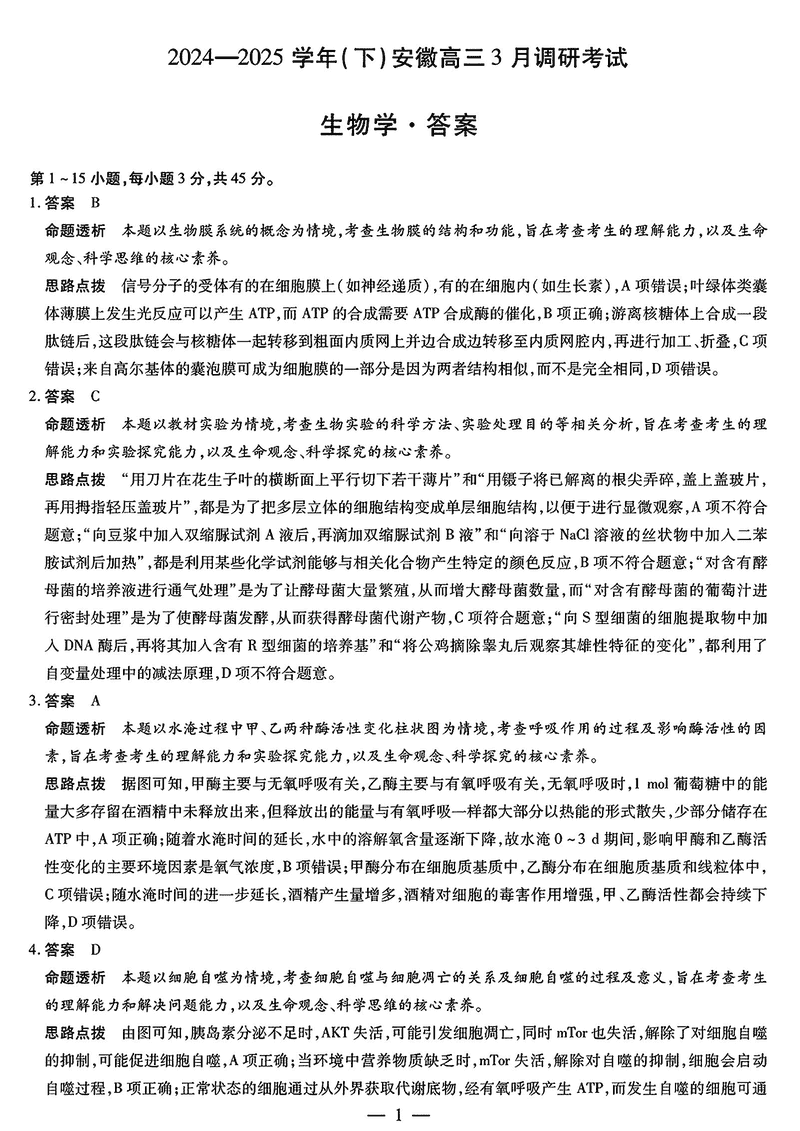 安徽省天一大联考2025届高三3月调研生物考试已于近日开考,为方便考生考后及时查看考试情况,查漏补缺、弥补不足,本文整理了试题答案解析相关信息!