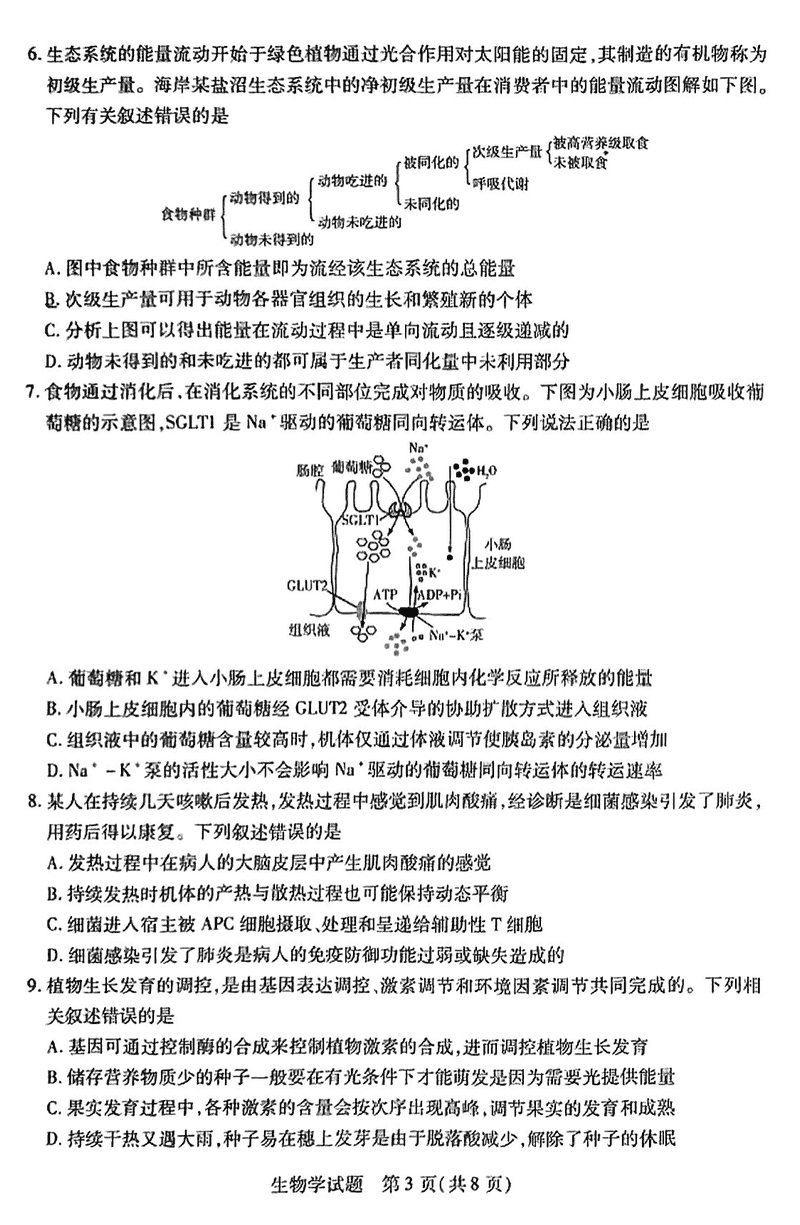 安徽省天一大联考2025届高三3月调研生物试题及答案