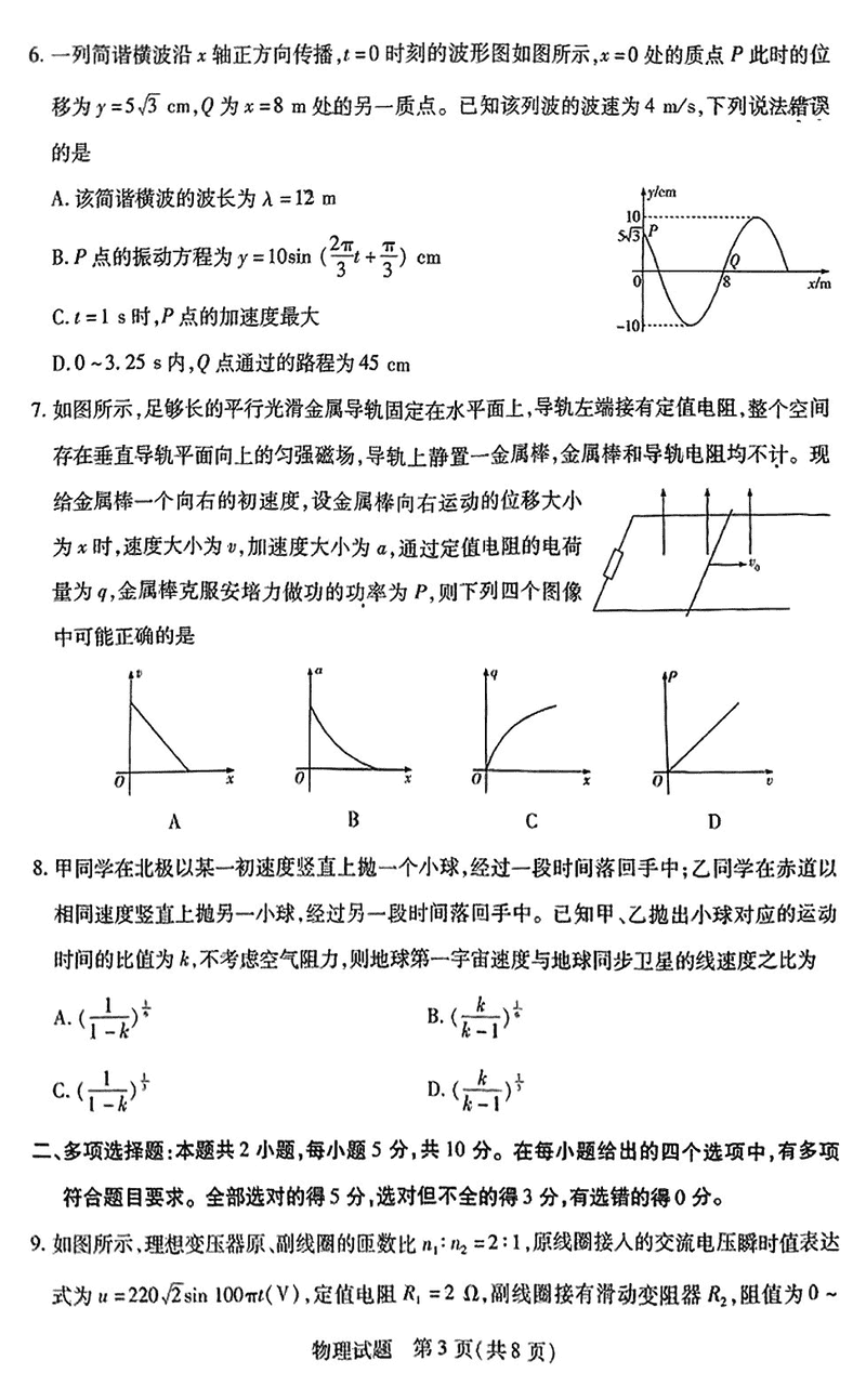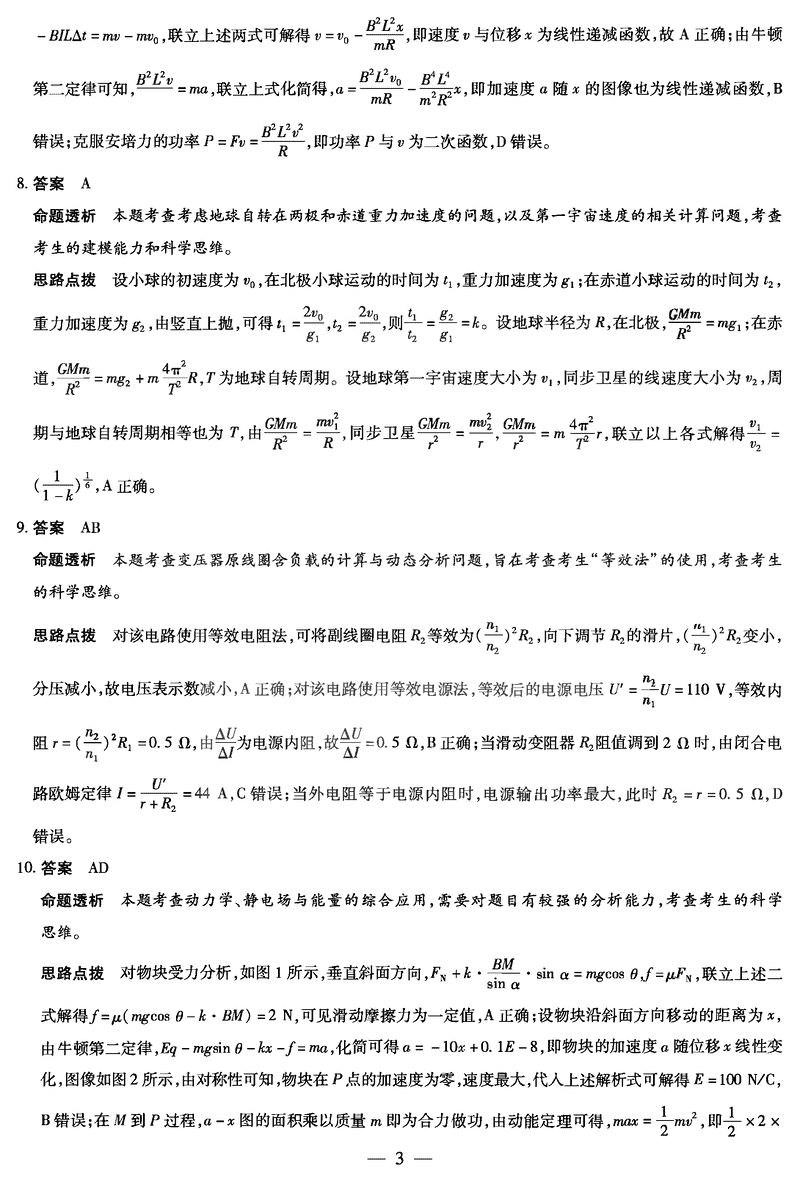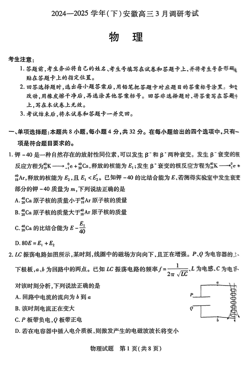 安徽省天一大联考2025届高三3月调研物理试题及答案