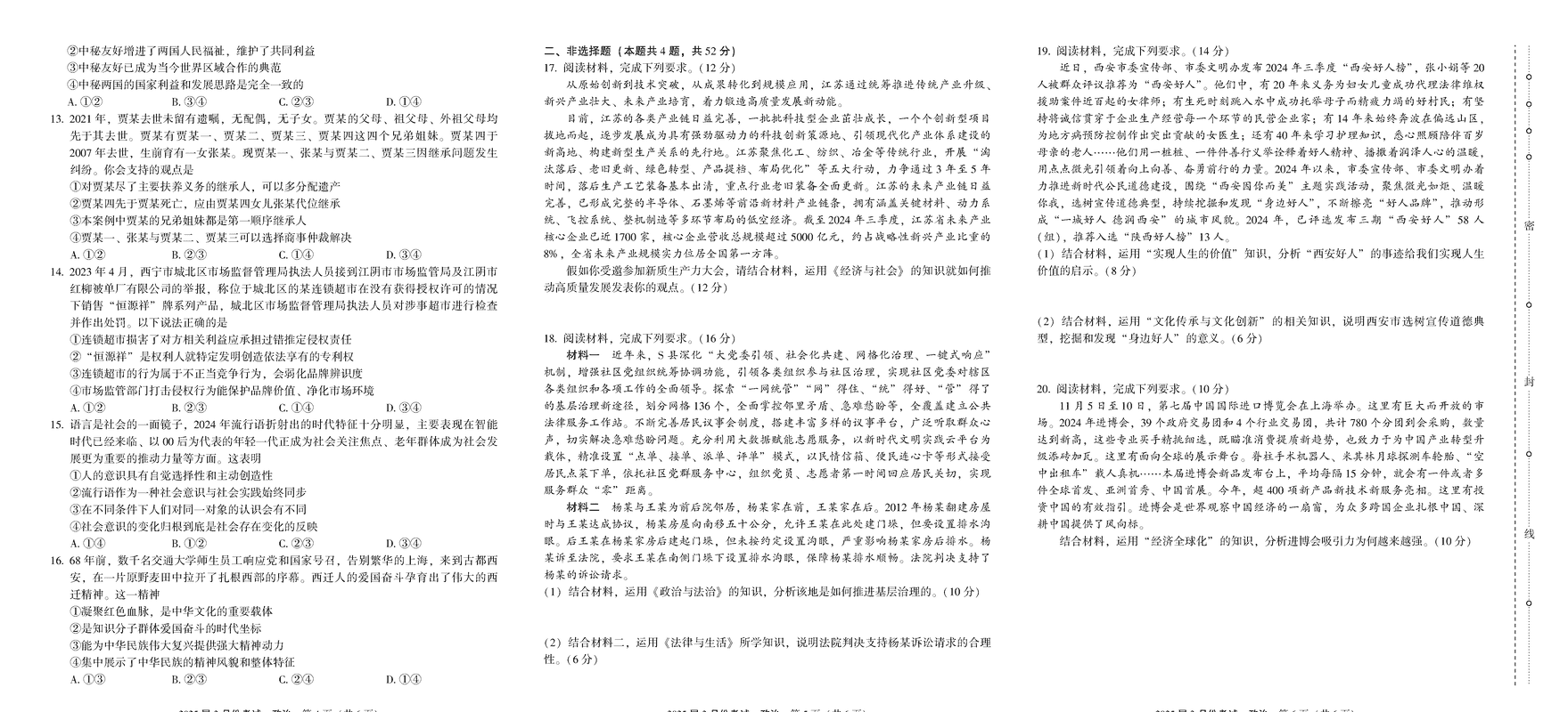 陕西省菁师联盟2025届高三3月联考政治试题及答案 时间:2025-03-09 陕西 文综试题 陕西省菁师联盟2025届高三3月联考政治考试已于近日开考,为方便考生考后及时查看考试情况,查漏补缺、弥补不足,本文整理了试题答案解析相关信息! 汇总:陕西省菁师联盟2025届高三3月联考试题及答案汇总 政治试题及答案解析