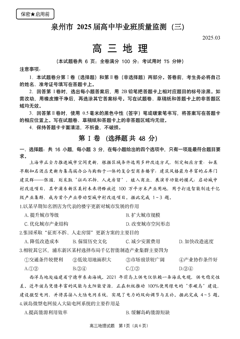 福建泉州2025届高中毕业班质量监测(三)地理考试已于近日开考,为方便考生考后及时查看考试情况,查漏补缺、弥补不足,本文整理了试题答案解析相关信息!
