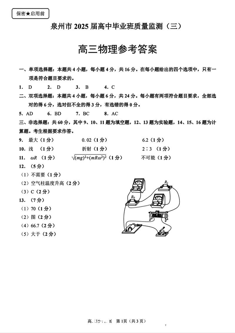 福建泉州2025届高中毕业班质量监测(三)物理考试已于近日开考,为方便考生考后及时查看考试情况,查漏补缺、弥补不足,本文整理了试题答案解析相关信息!