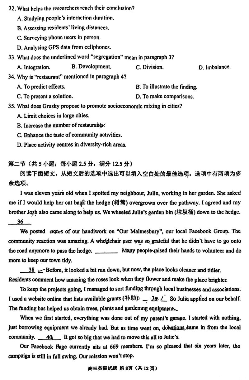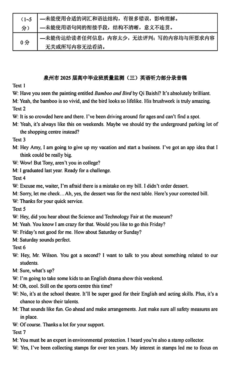 福建泉州2025届高中毕业班质量监测(三)英语试题及答案