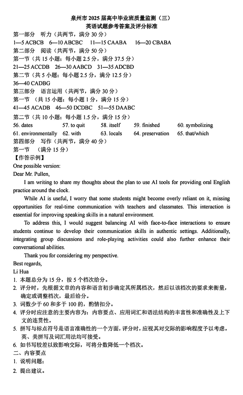 福建泉州2025届高中毕业班质量监测(三)英语考试已于近日开考,为方便考生考后及时查看考试情况,查漏补缺、弥补不足,本文整理了试题答案解析相关信息!
