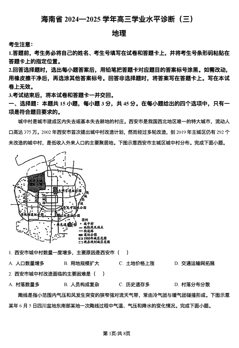 海南省天一大联考2024-2025学年高三学业水平诊断(三)地理试题及答案