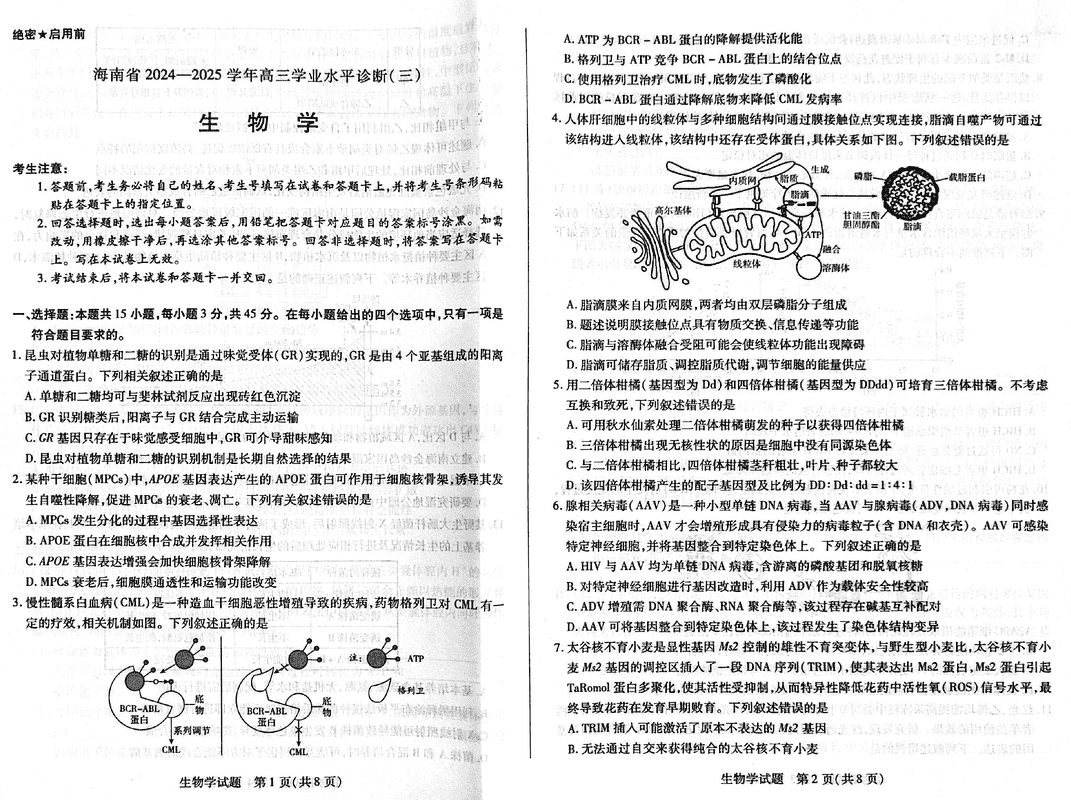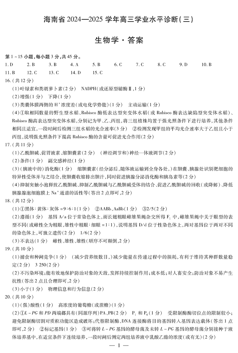 海南省天一大联考2024-2025学年高三学业水平诊断(三)生物试题及答案