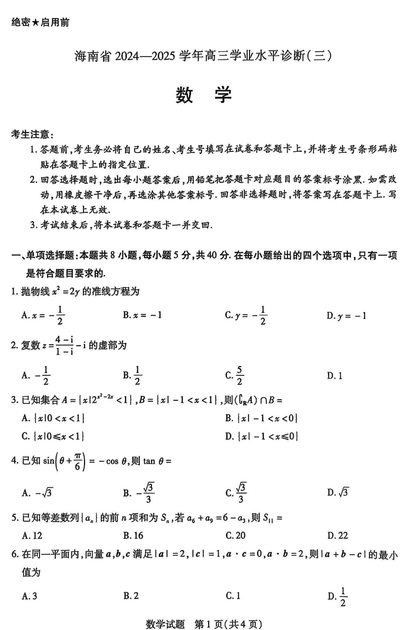 海南省天一大联考2024-2025学年高三学业水平诊断(三)数学考试已于近日开考,为方便考生考后及时查看考试情况,查漏补缺、弥补不足,本文整理了试题答案解析相关信息!
