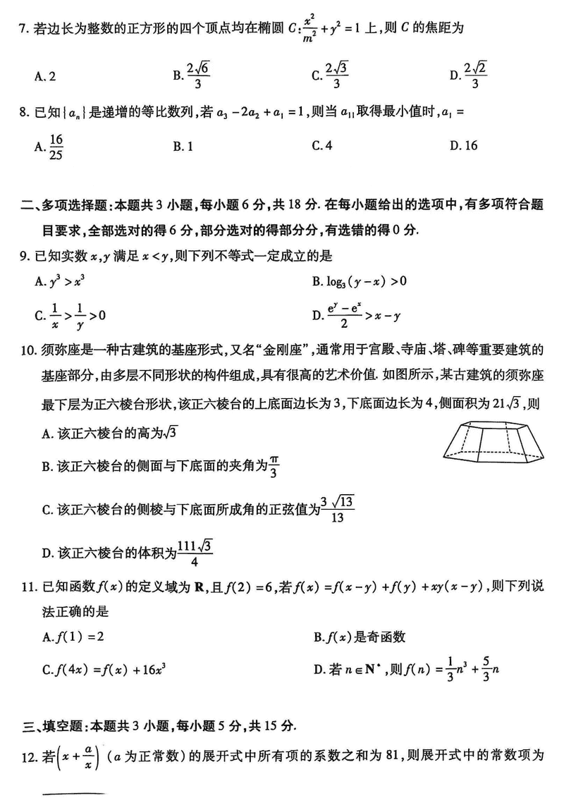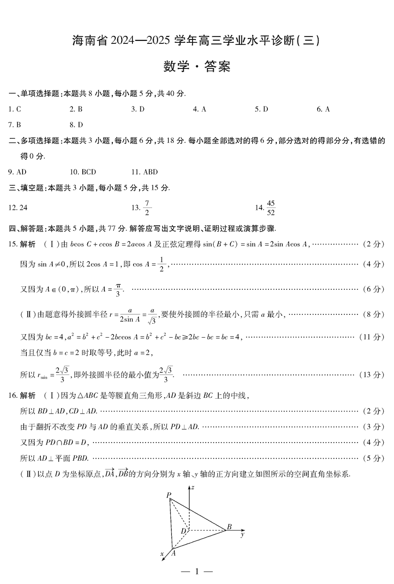 海南省天一大联考2024-2025学年高三学业水平诊断(三)数学试题及答案