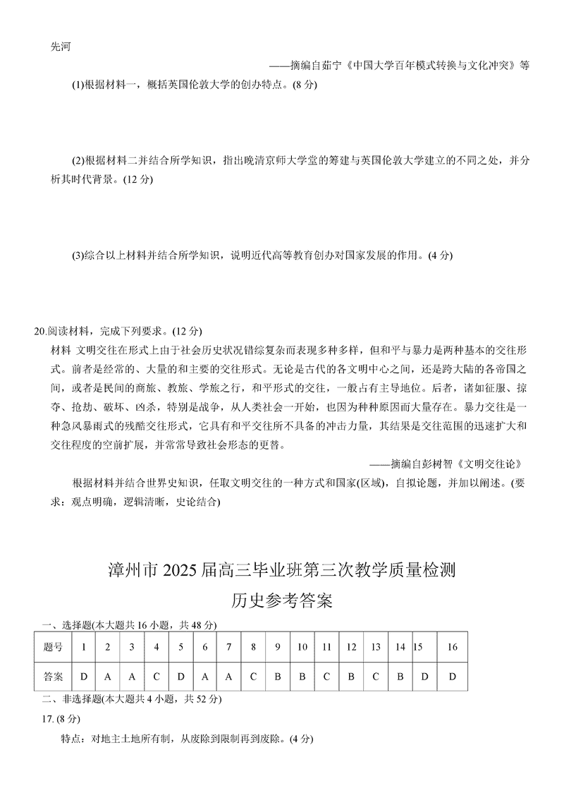 漳州市2025届高三第三次教学质检历史试题及答案 时间:2025-03-10 福建 文综试题 漳州市2025届高三第三次教学质检历史考试已于近日开考,为方便考生考后及时查看考试情况,查漏补缺、弥补不足,本文整理了试题答案解析相关信息! 汇总:漳州市2025届高三第三次教学质量检测试题及答案汇总 历史试题及答案解析