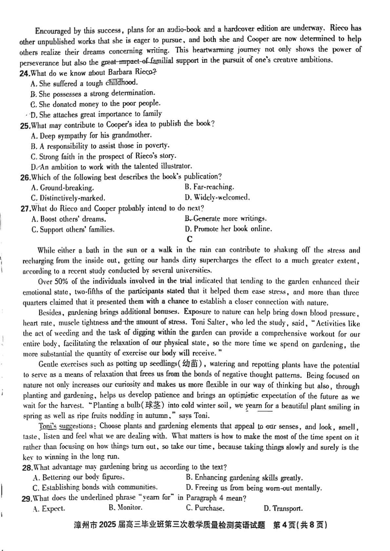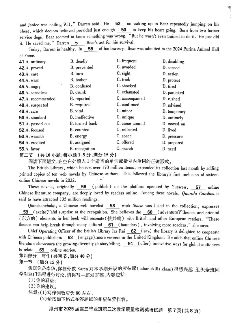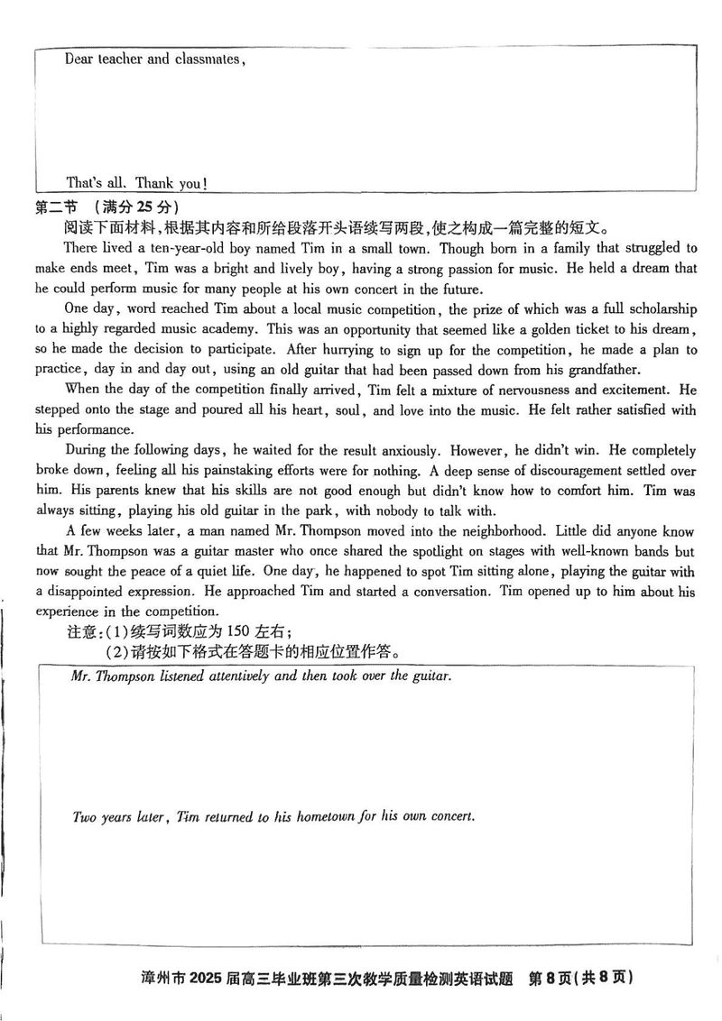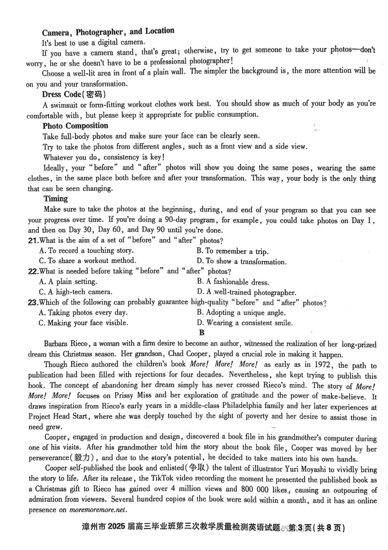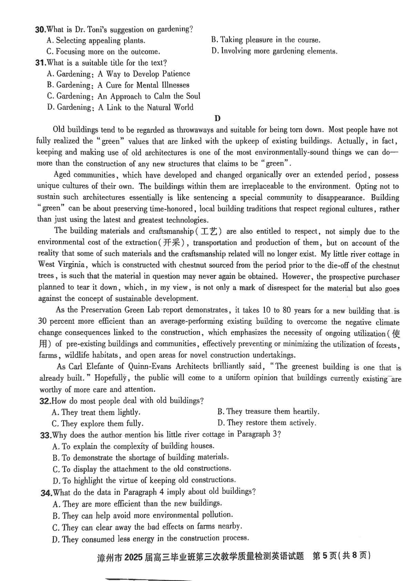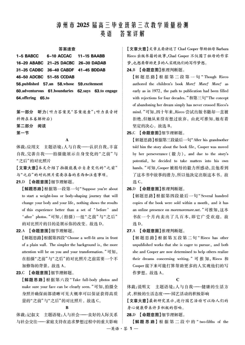 漳州市2025届高三第三次教学质检英语试题及答案 时间:2025-03-10 福建 英语试题 漳州市2025届高三第三次教学质检英语考试已于近日开考,为方便考生考后及时查看考试情况,查漏补缺、弥补不足,本文整理了试题答案解析相关信息! 汇总:漳州市2025届高三第三次教学质量检测试题及答案汇总 英语试题及答案解析