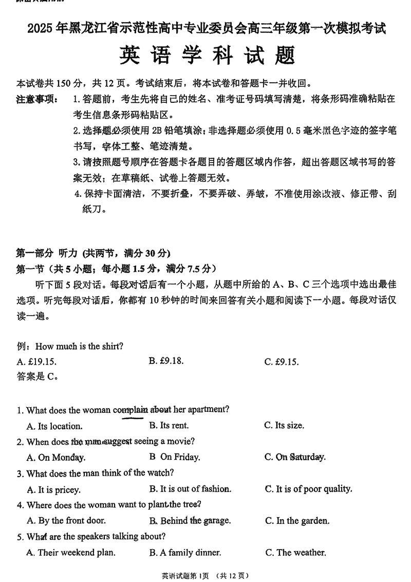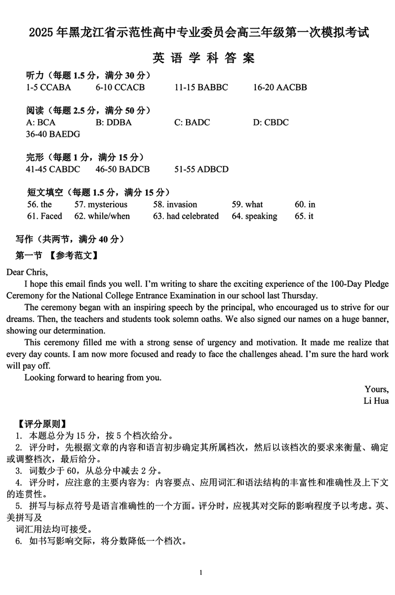 黑龙江教育学会示范性高中专业委员会2025高三第一次模考英语考试已于近日开考,为方便考生考后及时查看考试情况,查漏补缺、弥补不足,本文整理了试题答案解析相关信息!