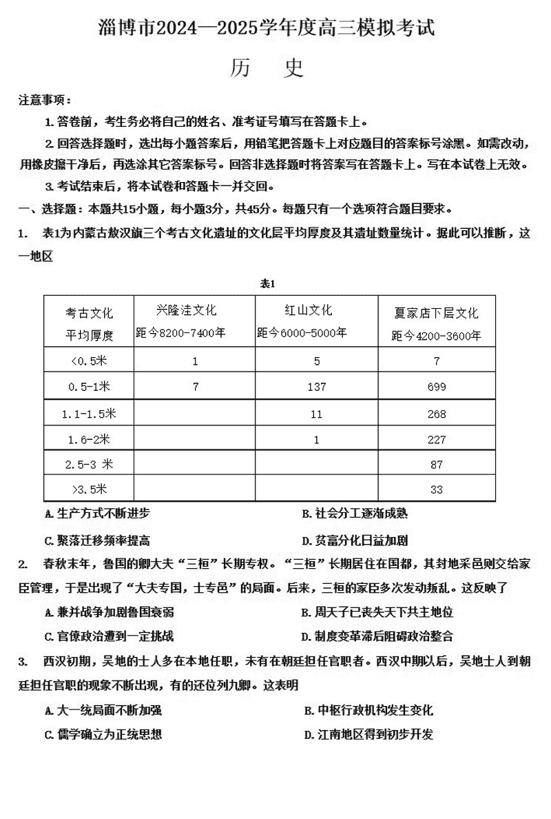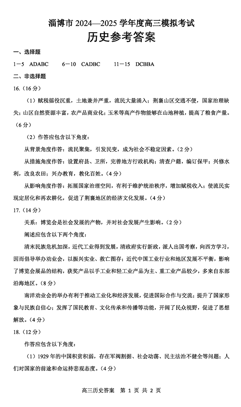 淄博市、滨州市2025届高三下学期3月一模历史试题及答案