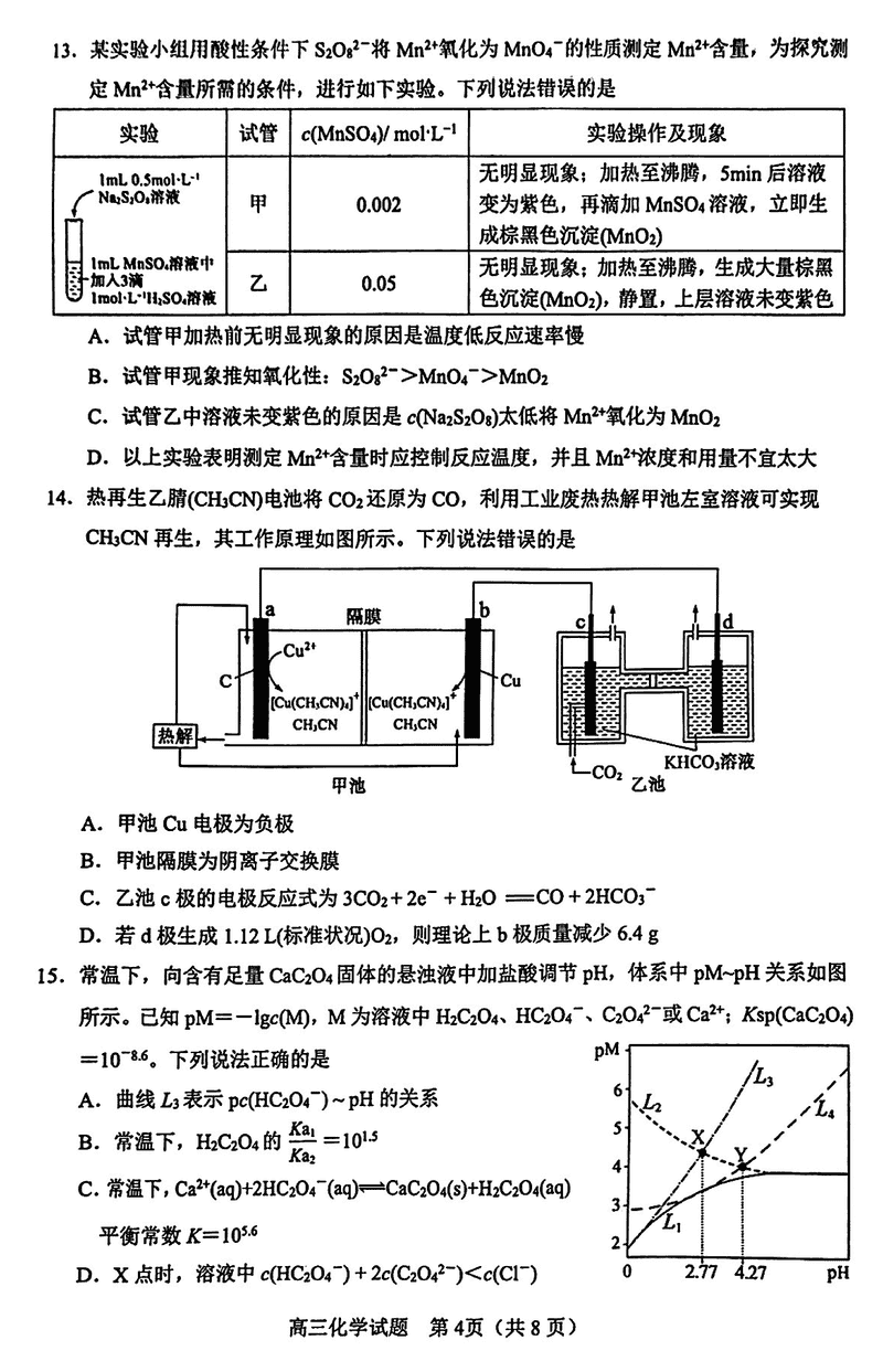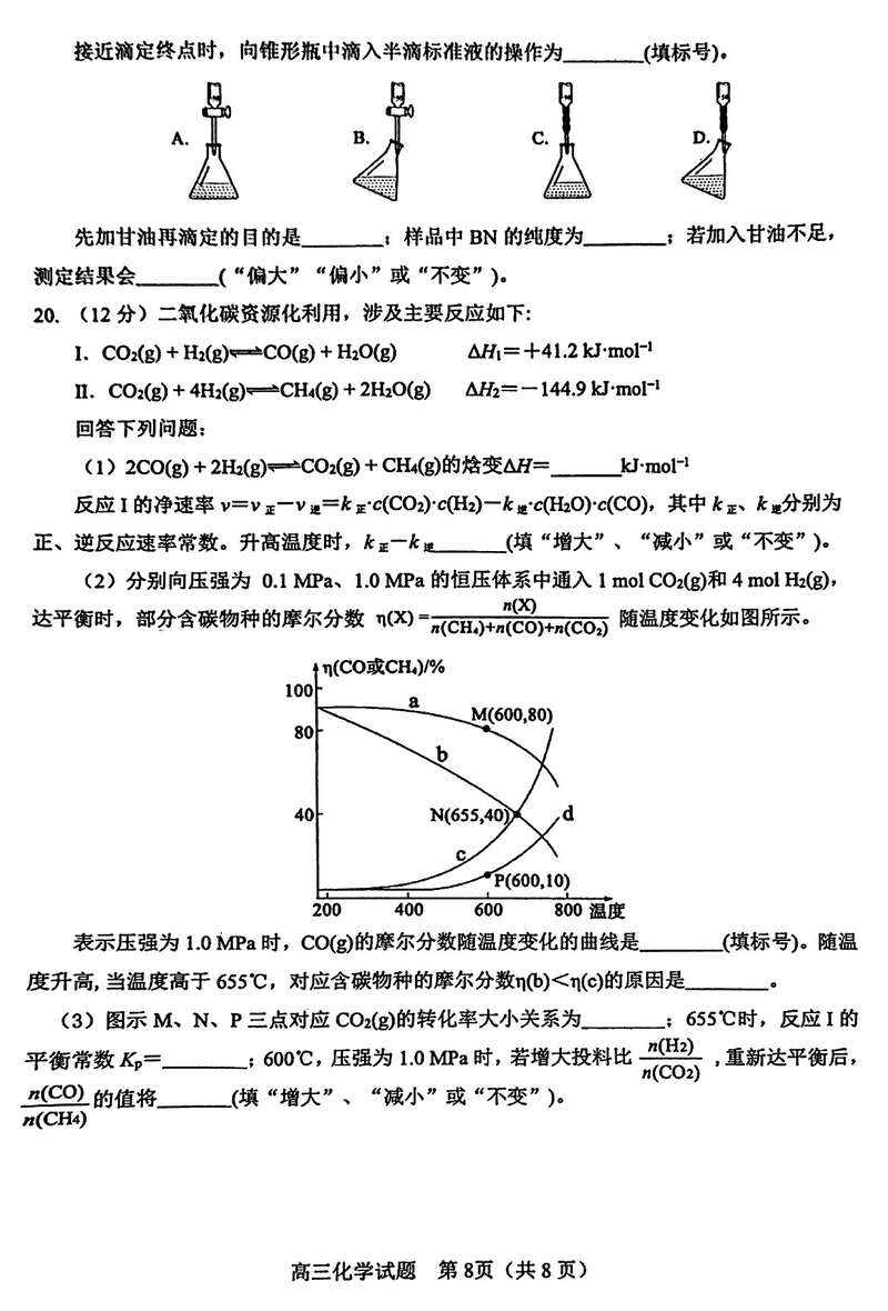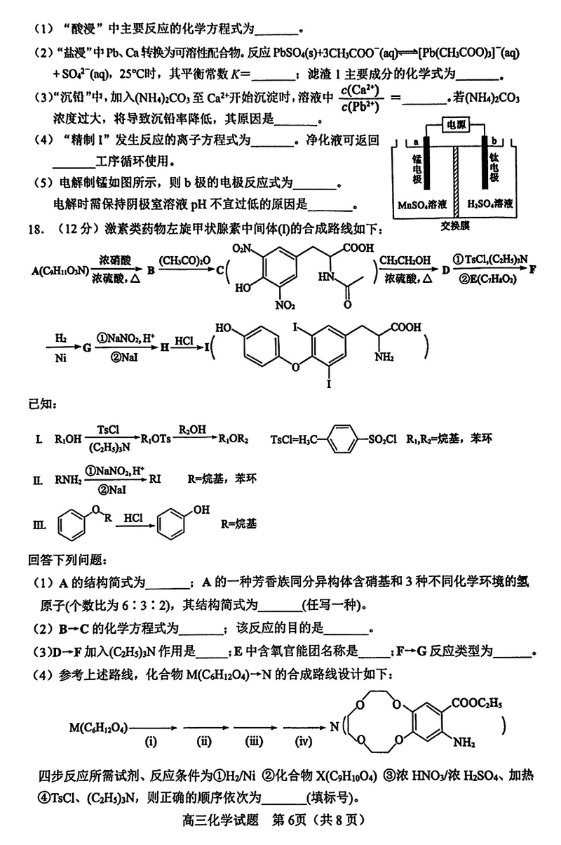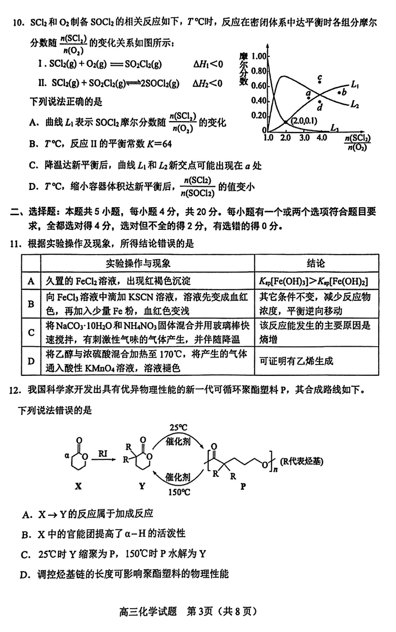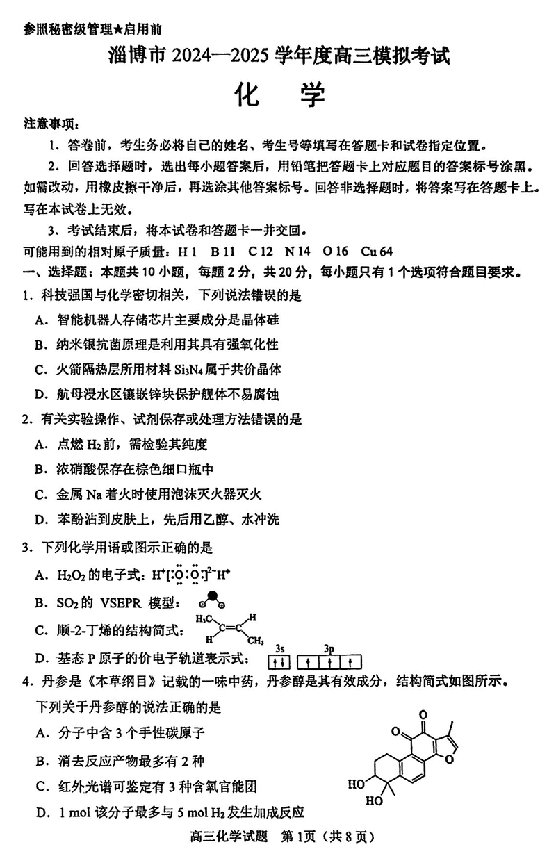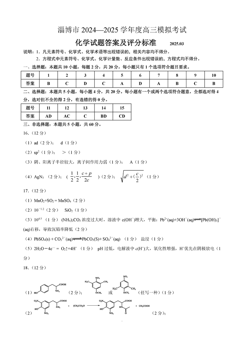 淄博市、滨州市2025届高三下学期3月一模化学试题及答案