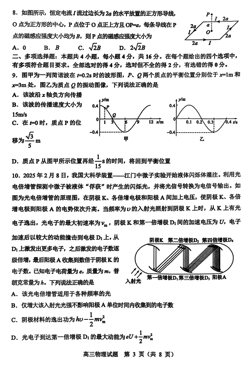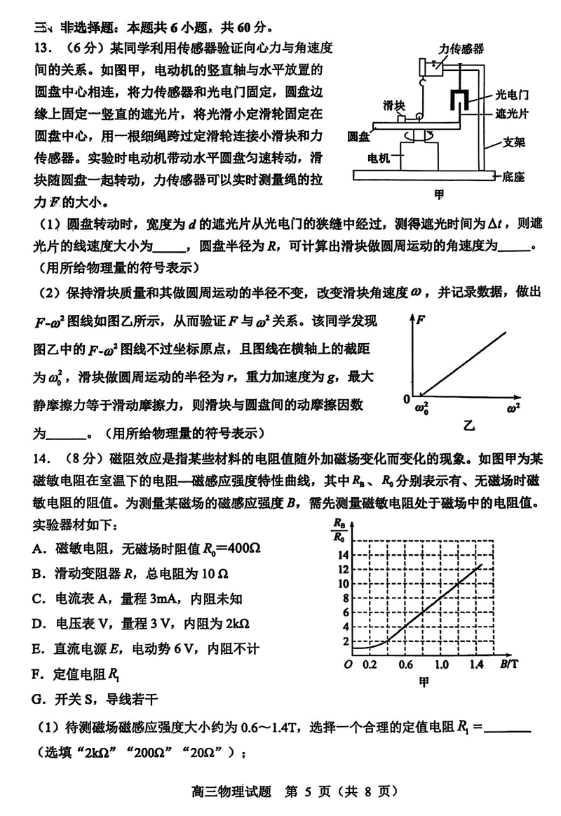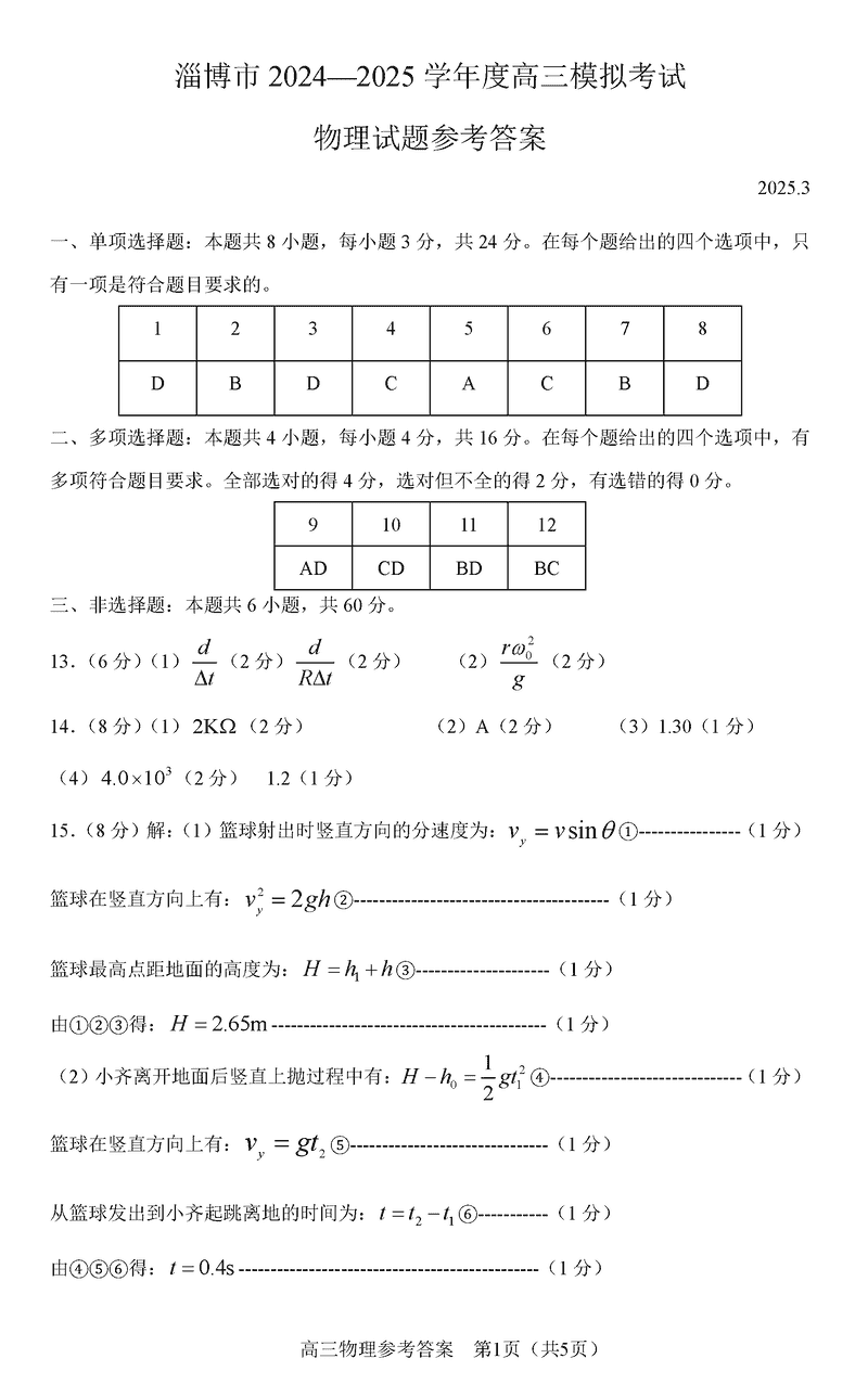 淄博市、滨州市2025届高三下学期3月一模物理试题及答案