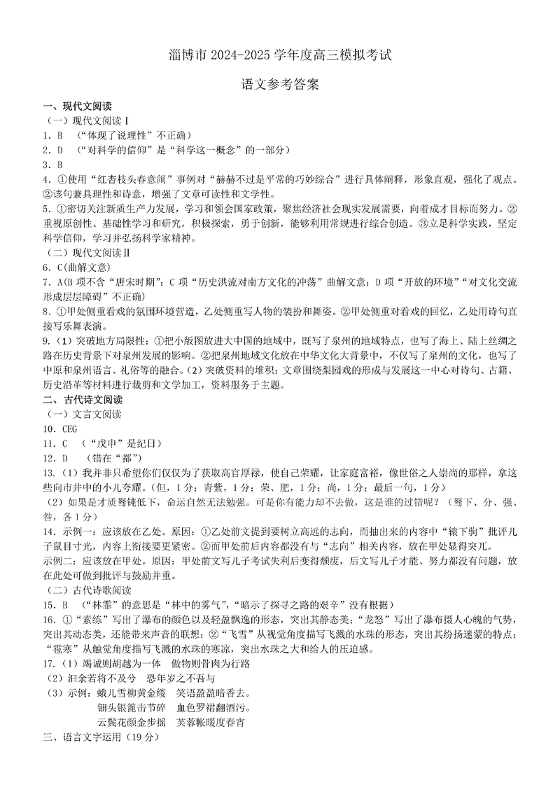 淄博市、滨州市2025届高三下学期3月一模语文试题及答案