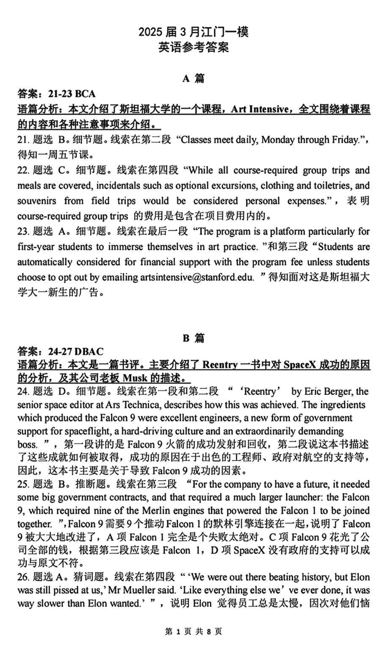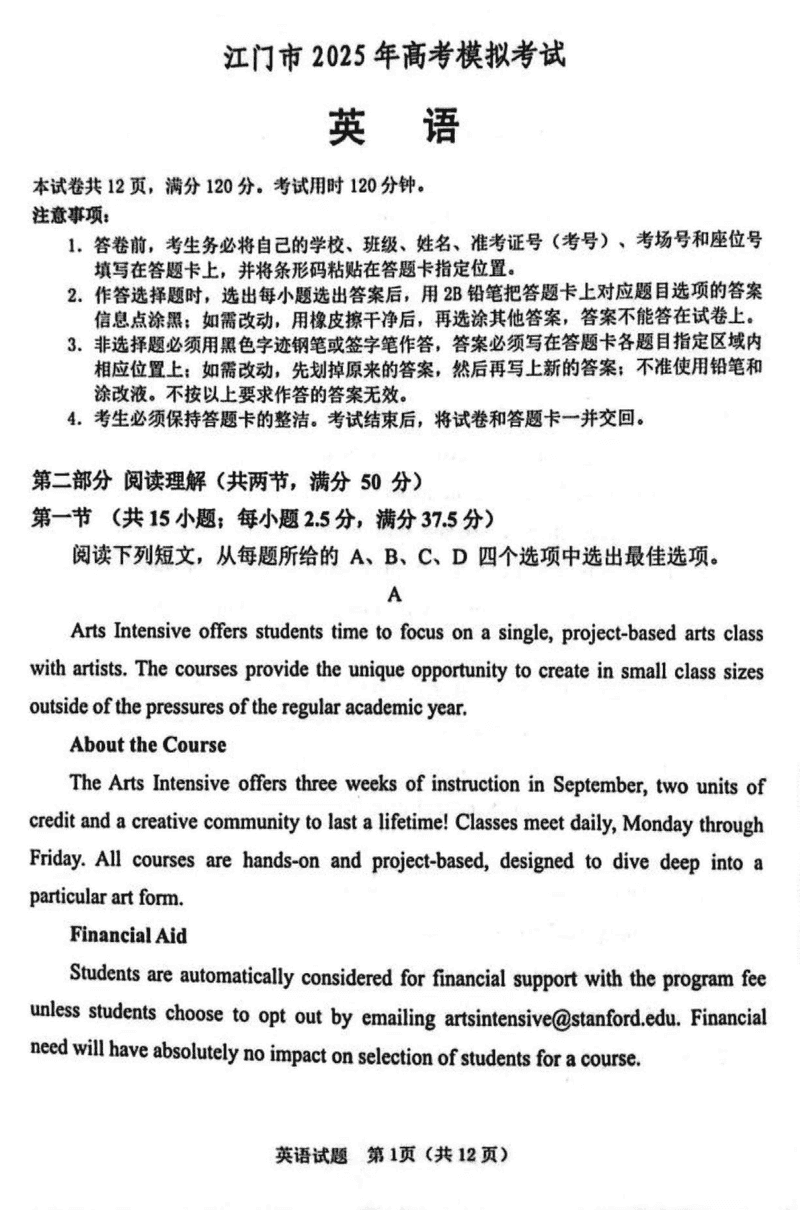 广东江门2025届高三一模英语试题及答案 时间:2025-03-11 广东 英语试题 广东江门2025届高三一模英语考试已于近日开考,为方便考生考后及时查看考试情况,查漏补缺、弥补不足,本文整理了试题答案解析相关信息! 汇总:广东江门2025届高三一模试题及答案汇总 英语试题及答案解析