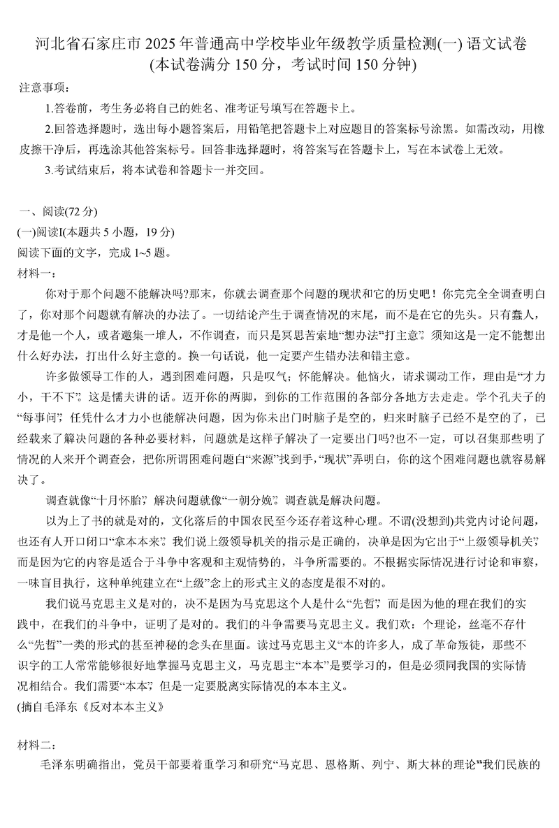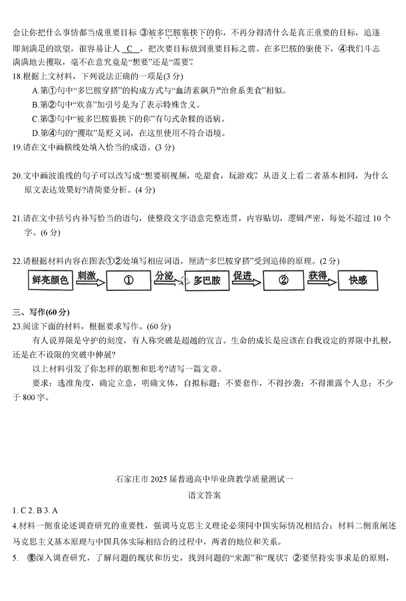 2025届石家庄市高三教学质量检测(一)语文试题及答案