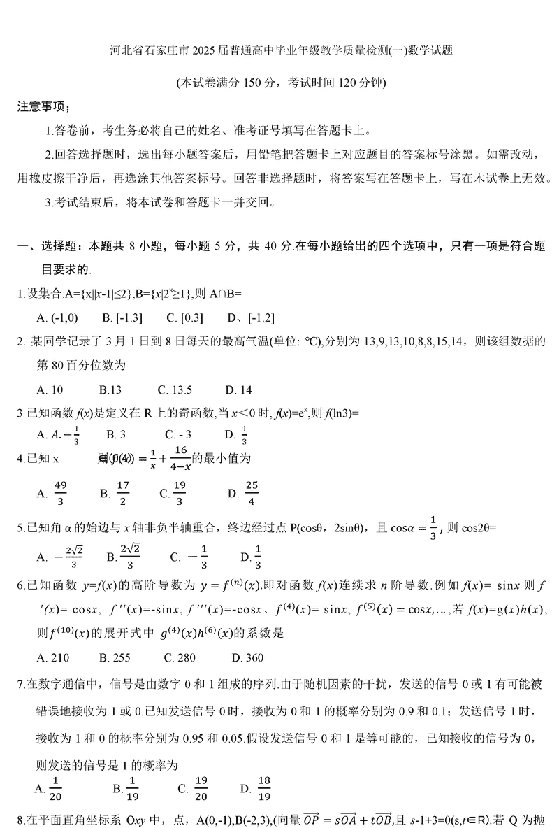 2025届石家庄市高三教学质量检测(一)数学试题及答案
