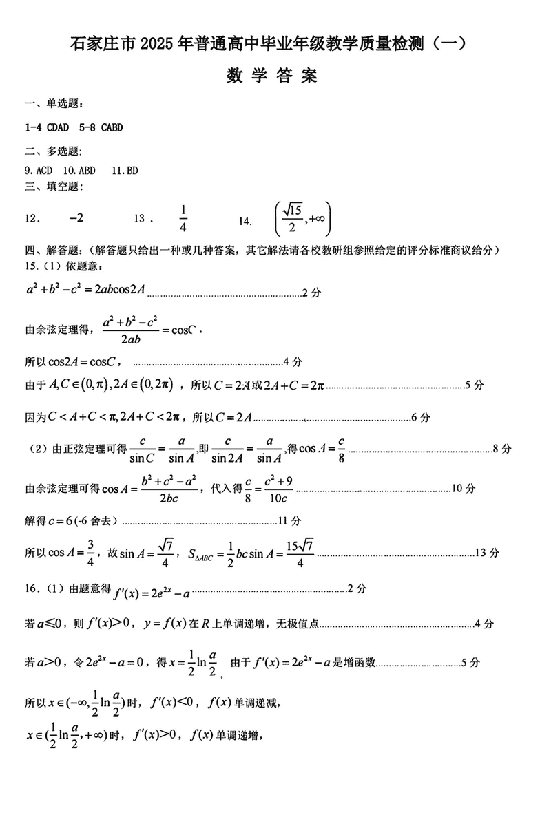 2025届石家庄市高三教学质量检测(一)数学考试已于近日开考,为方便考生考后及时查看考试情况,查漏补缺、弥补不足,本文整理了试题答案解析相关信息!