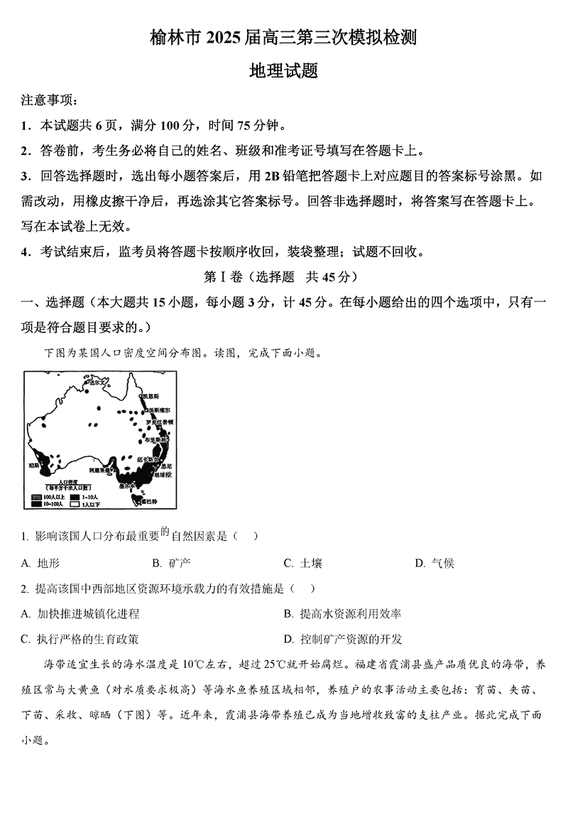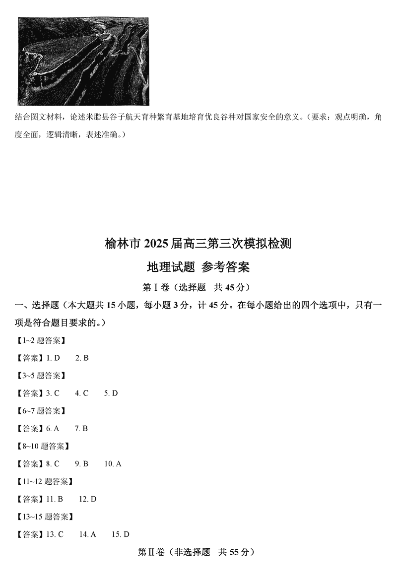 陕西榆林2025届高三第三次模拟检测地理试题及答案 时间:2025-03-11 陕西 文综试题 陕西榆林2025届高三第三次模拟检测地理考试已于近日开考,为方便考生考后及时查看考试情况,查漏补缺、弥补不足,本文整理了试题答案解析相关信息! 汇总:陕西榆林2025届高三第三次模拟检测试题及答案汇总 地理试题及答案解析