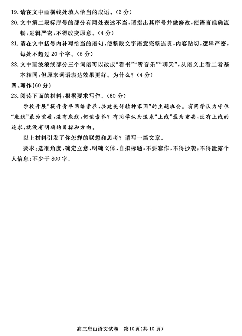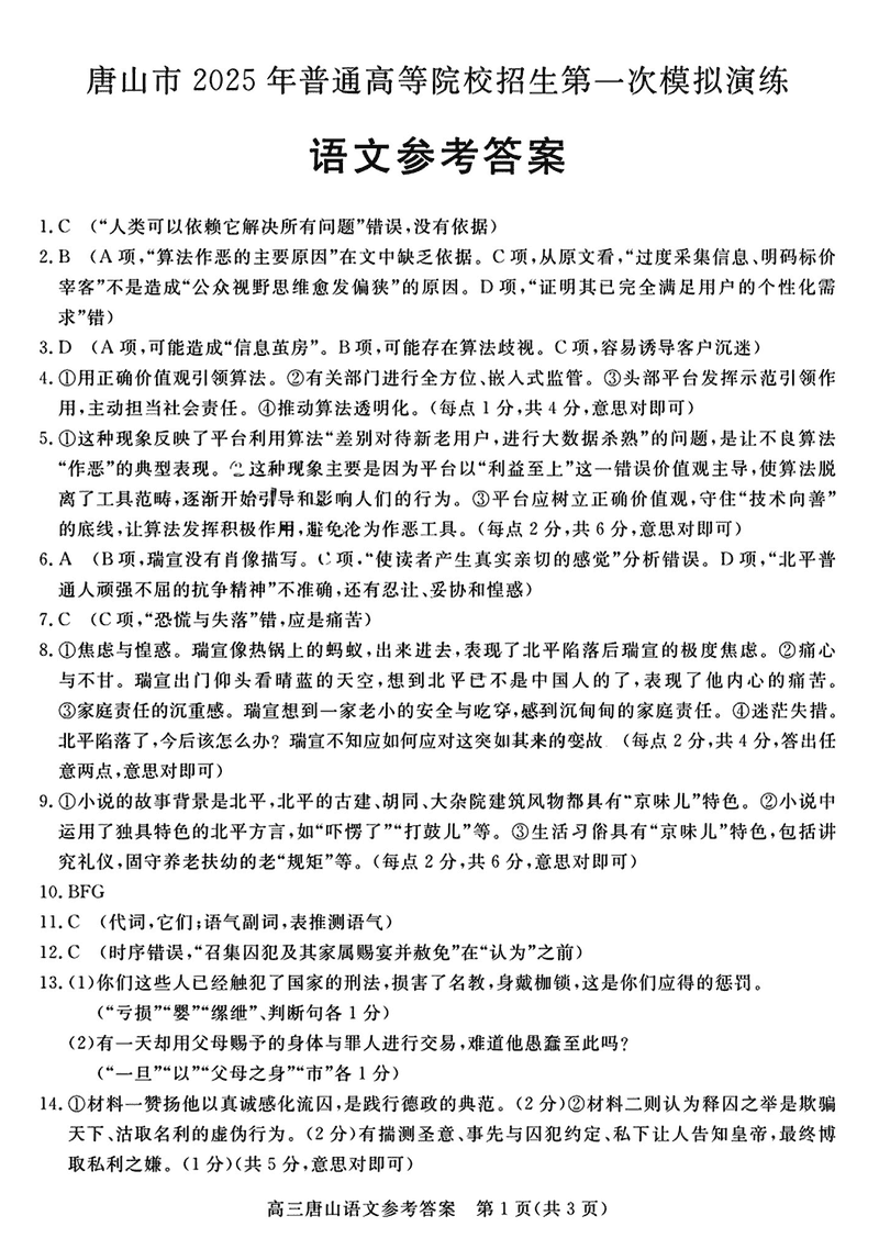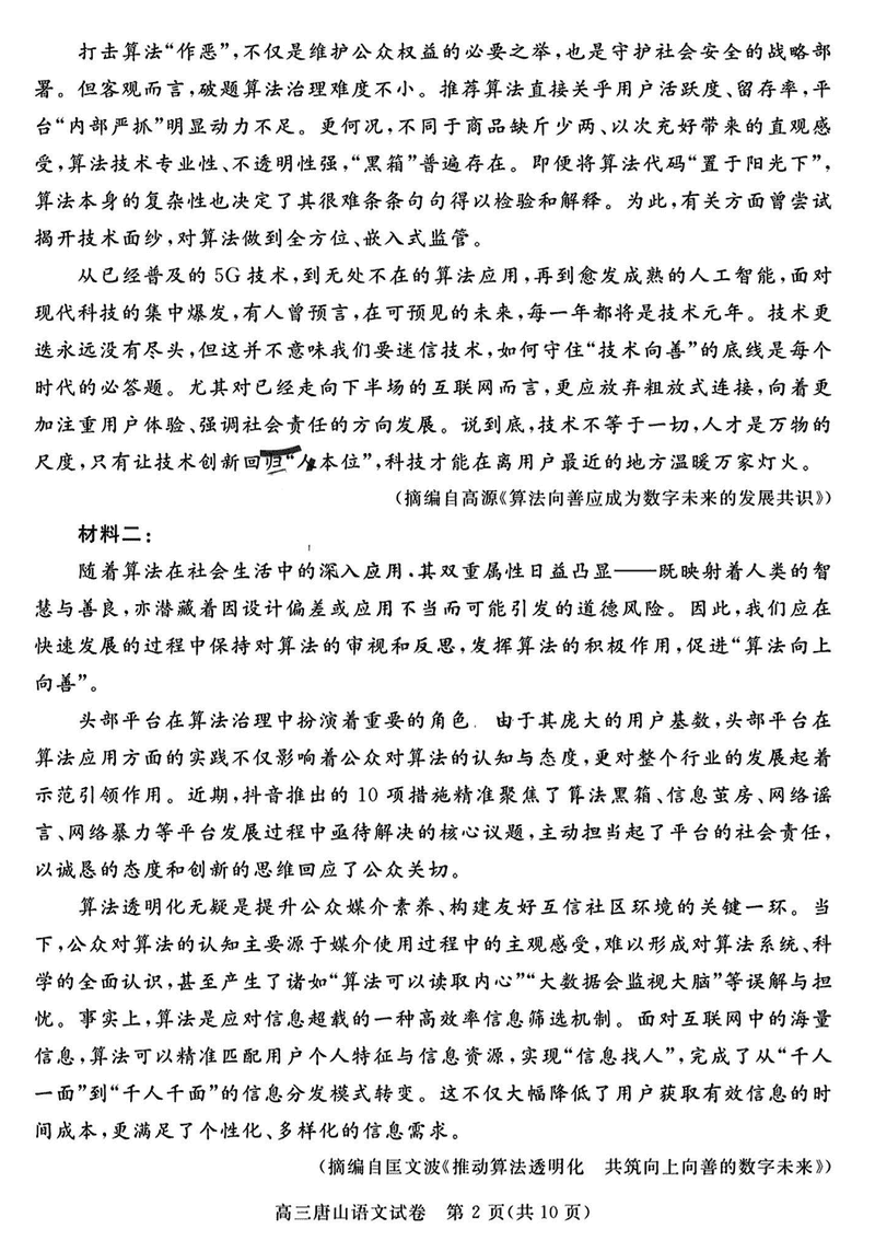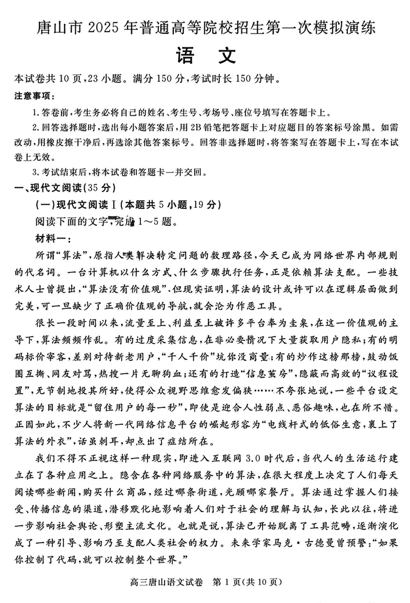 唐山一模2025年普通高等院校招生第一次拟演练语文试题及答案