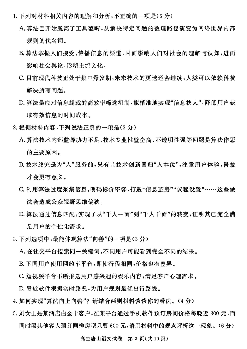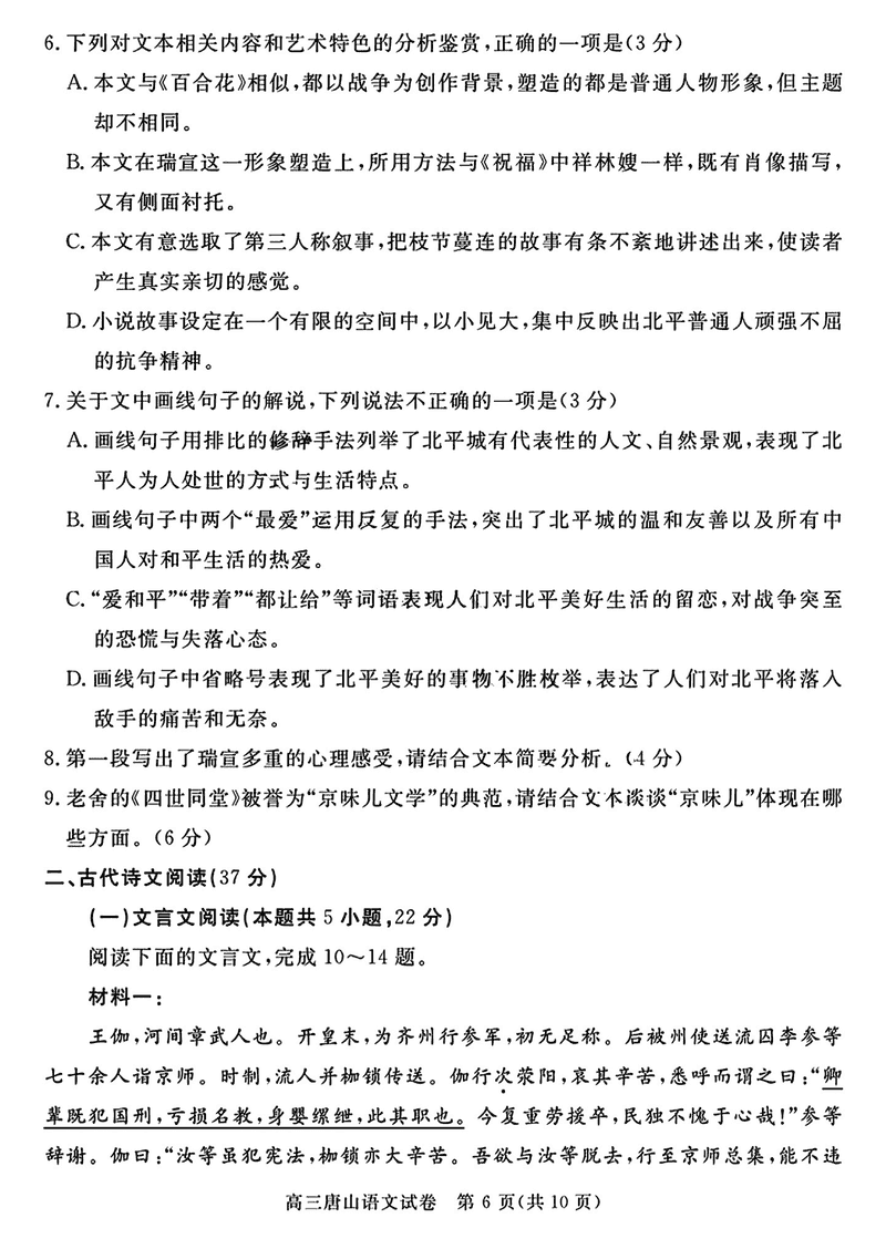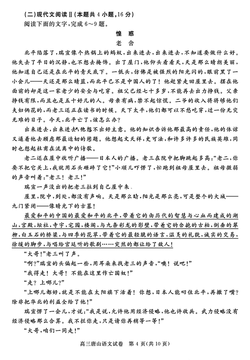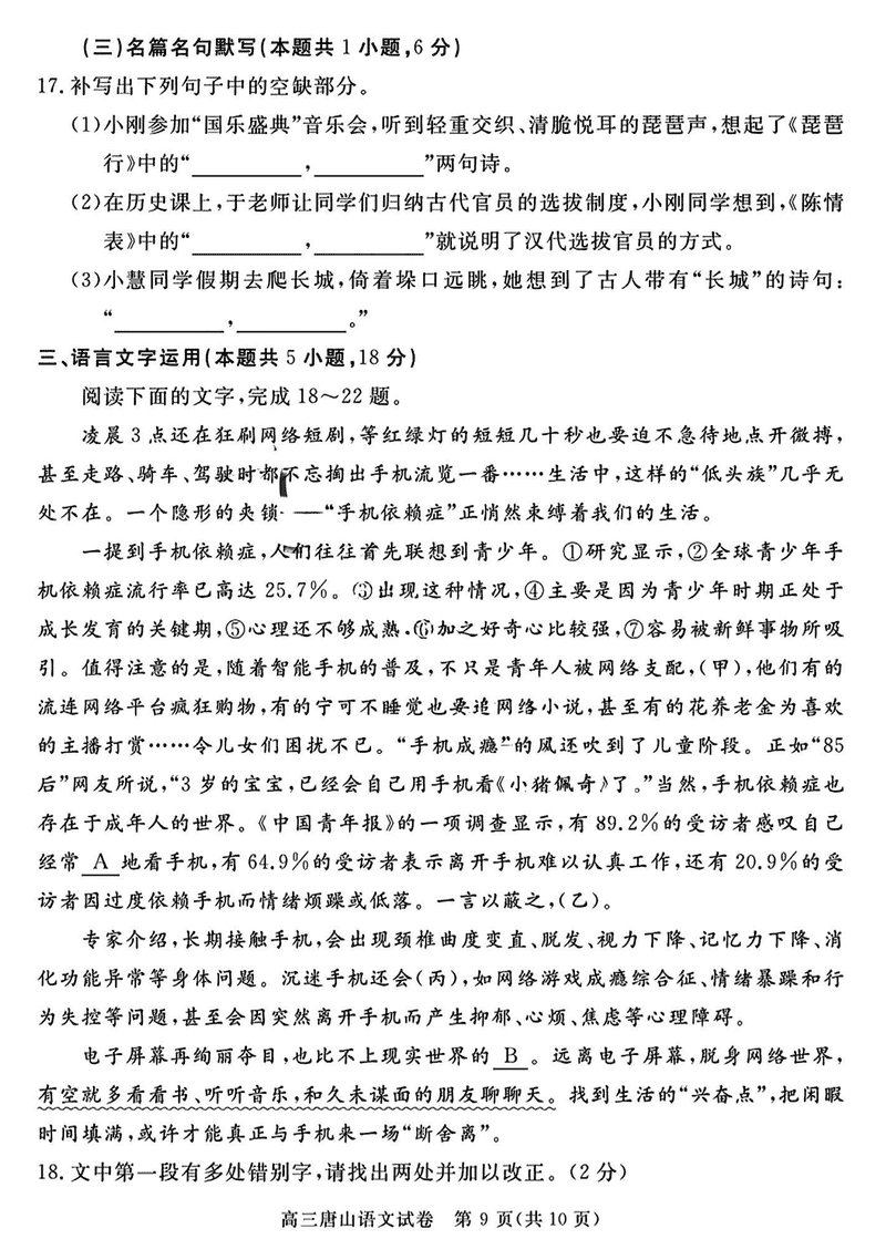 唐山一模2025年普通高等院校招生第一次拟演练语文试题及答案