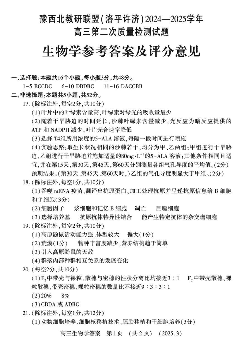 河南豫西北教研联盟(洛平许济)2025年高三下学期第二次质量检测生物考试已于近日开考,为方便考生考后及时查看考试情况,查漏补缺、弥补不足,本文整理了试题答案解析相关信息!