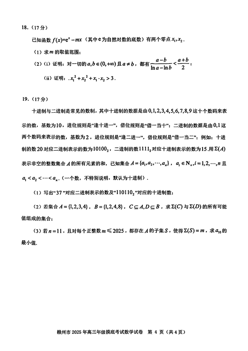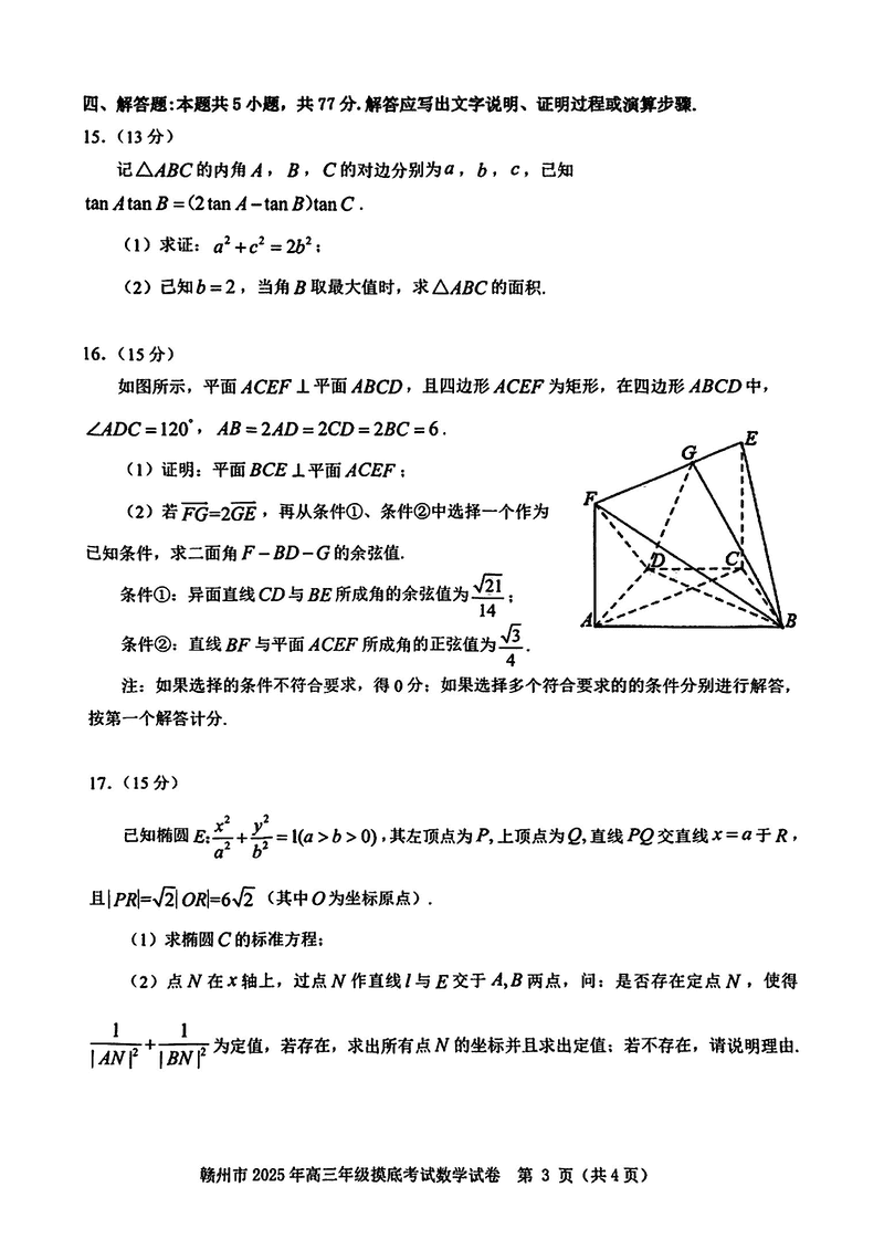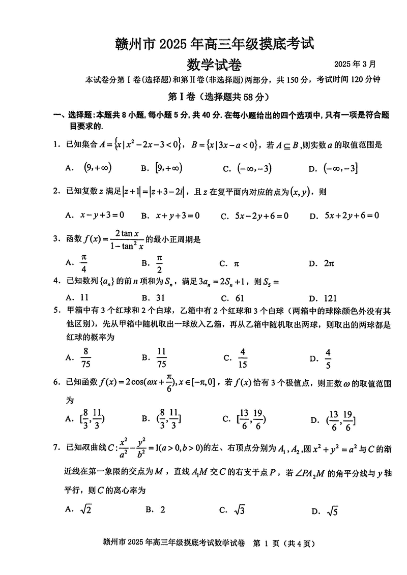2025届江西赣州高三下学期3月一模数学试题及答案 时间:2025-03-12 江西 数学试题 2025届江西赣州高三下学期3月一模数学考试已于近日开考,为方便考生考后及时查看考试情况,查漏补缺、弥补不足,本文整理了试题答案解析相关信息! 汇总:2025届江西赣州高三下学期3月一模试题及答案汇总 数学试题及答案解析