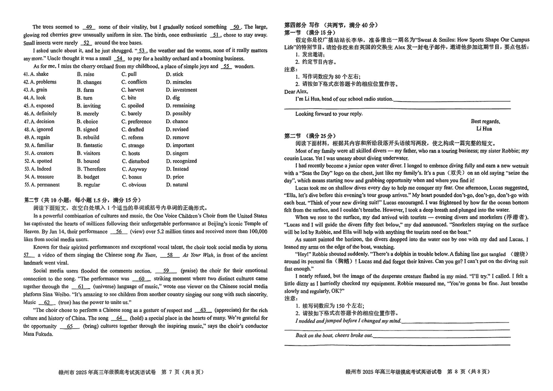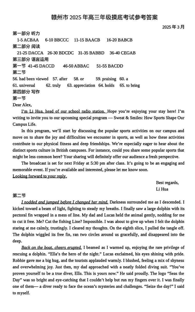 2025届江西赣州高三下学期3月一模英语试题及答案 时间:2025-03-12 江西 英语试题 2025届江西赣州高三下学期3月一模英语考试已于近日开考,为方便考生考后及时查看考试情况,查漏补缺、弥补不足,本文整理了试题答案解析相关信息! 汇总:2025届江西赣州高三下学期3月一模试题及答案汇总 英语试题及答案解析