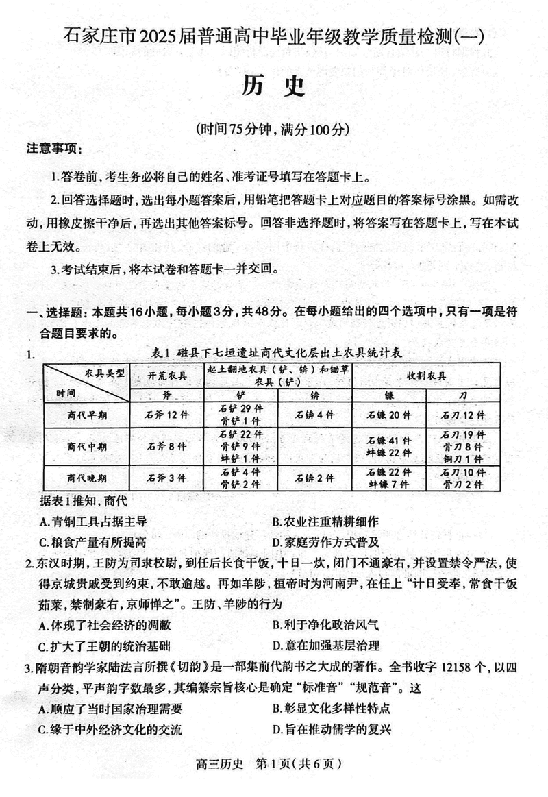 2025届石家庄市高三教学质量检测(一)历史试题及答案