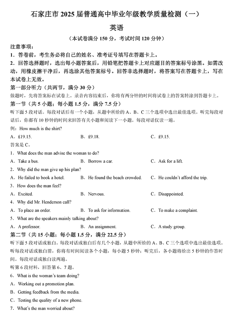 2025届石家庄市高三教学质量检测(一)英语试题及答案
