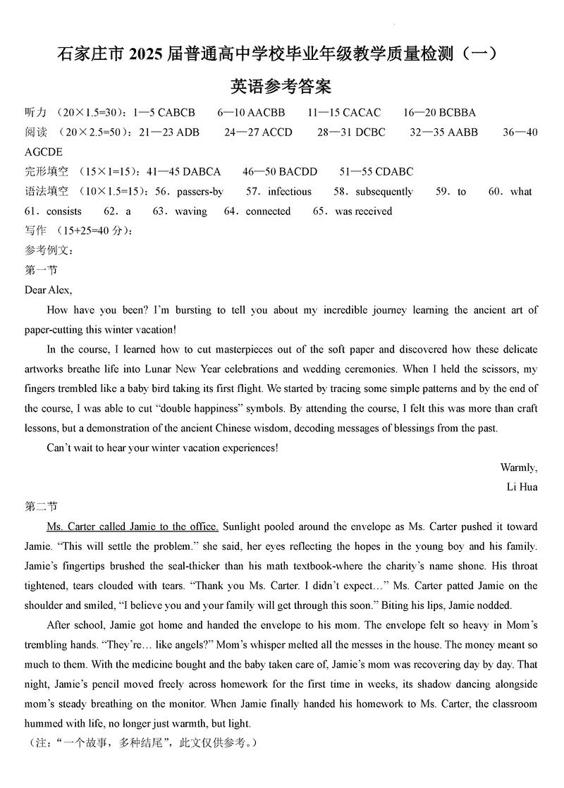 2025届石家庄市高三教学质量检测(一)英语考试已于近日开考,为方便考生考后及时查看考试情况,查漏补缺、弥补不足,本文整理了试题答案解析相关信息!
