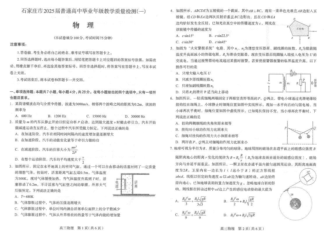2025届石家庄市高三教学质量检测(一)物理试题及答案